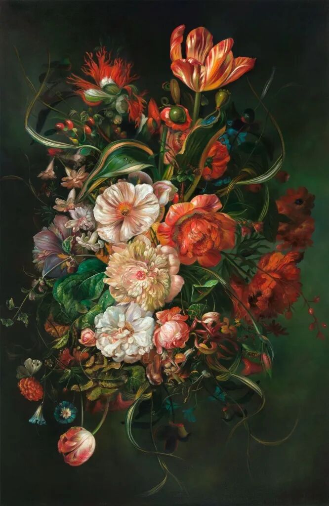 泰德·皮姆曾看过一部自然纪录片,讲述一棵在森林中倒下的大树。在片中,他见识到了大树倒下所引发的一连串后续影响:看到了那些在森林地面的动植物如何挣扎着,相互攀越以试图获得日照光线。“我就是如此看待我的花卉绘画,”皮姆解释道:“在美丽外表之下——或者说作为其中的一部分,蕴藏的一种暗黑调性。”