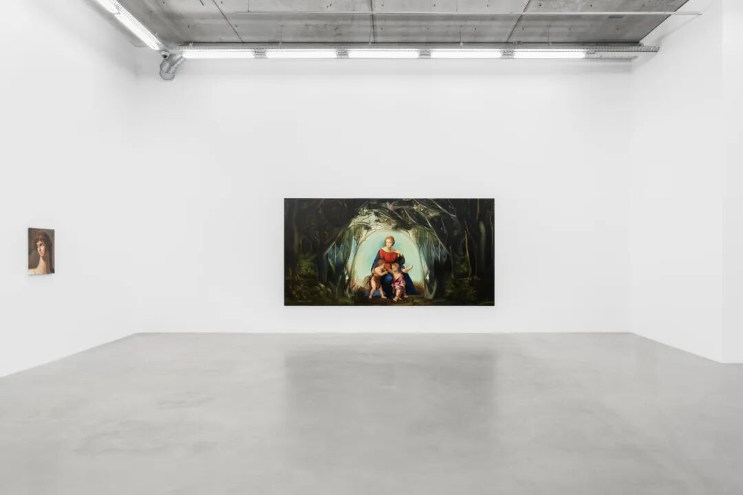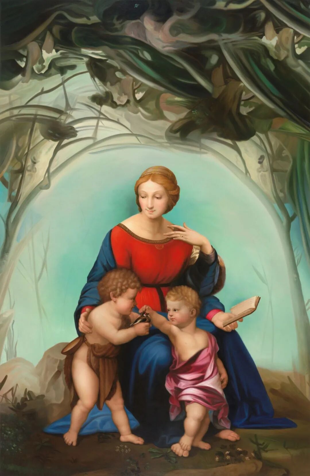 其画中的不同艺术灵感来源,有些相较起来更容易被识别。此次展中的起点是一幅三联画,在其中皮姆所刻画的《圣母与圣婴》便是直接参考了拉斐尔创作于1506年的描绘圣母子与施洗者圣约翰的画作,后世称之为《金翅雀圣母》(Madonna of the Goldfinch)因施洗者圣约翰抱着一只小鸟将它展示给耶稣,耶稣轻抚着它。在爱尔兰贝尔法斯特长大的皮姆曾是天主教徒,尽管如今他不再信教,但他童年时期在教堂里看到的图像早已经融入并启发他的艺术创作:“我仍然着迷于那华丽浮夸的一切,金色装饰与巴洛克风格的绘画,当你走进一座大教堂时油然而生的敬畏之情”。拉斐尔笔下对圣母诸多特色的描绘是天主教中最具标志性的形象。