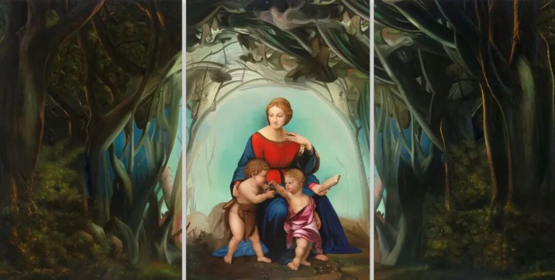 但在这幅三联画中,却也展示了另一种创造世界的方式——这是与人工智能合作的艺术成果。当一家人工智能公司邀请皮姆想象如何通过与人工智能合作影响其艺术实践时,他提供了能输入软件的文字描述,这些文字包含他画作中出现过的艺术元素的单词列表,而最终人工智能输出的结果便是他可以融入新作品的图像来源。在此之前,皮姆所创作的最后一系列作品,灵感便来自迪斯尼电影。于是人工智能软件便将拉斐尔的圣母、圣婴和施洗者圣约翰化作迪斯尼人物。人工智能还创造了皮姆画中圣母身处的拱形森林背景。这个场景立刻让皮姆想起了爱尔兰的礼拜石群,这是在爱尔兰天主教徒在英国征服爱尔兰后禁止天主教信仰,从而到大自然中聚会,以石头做为祭坛的场地。