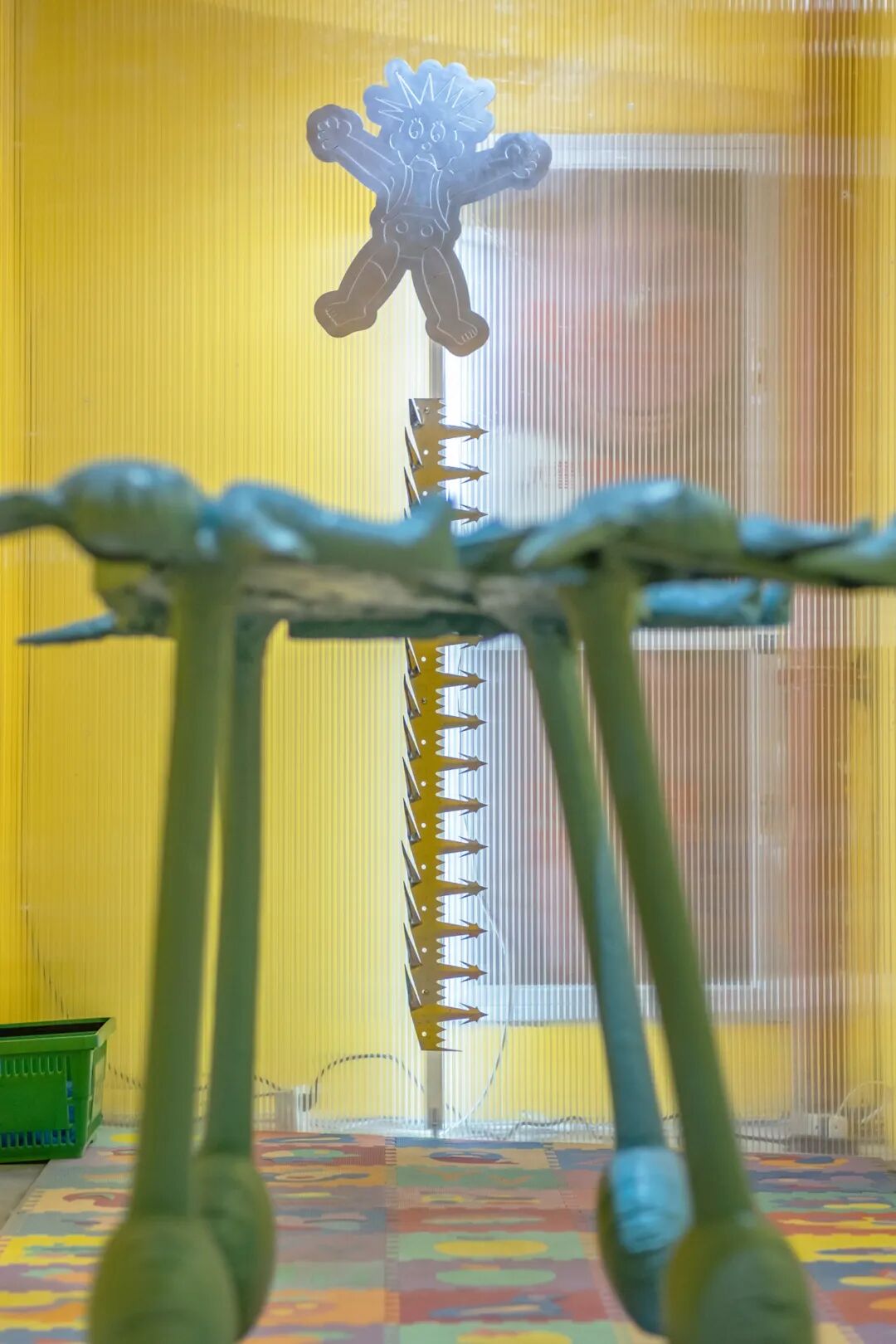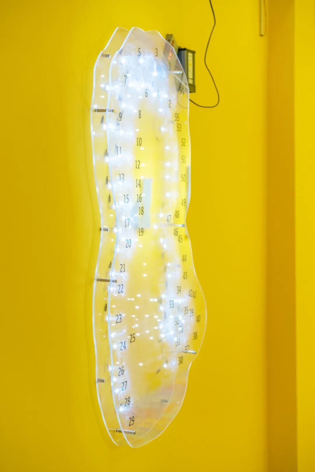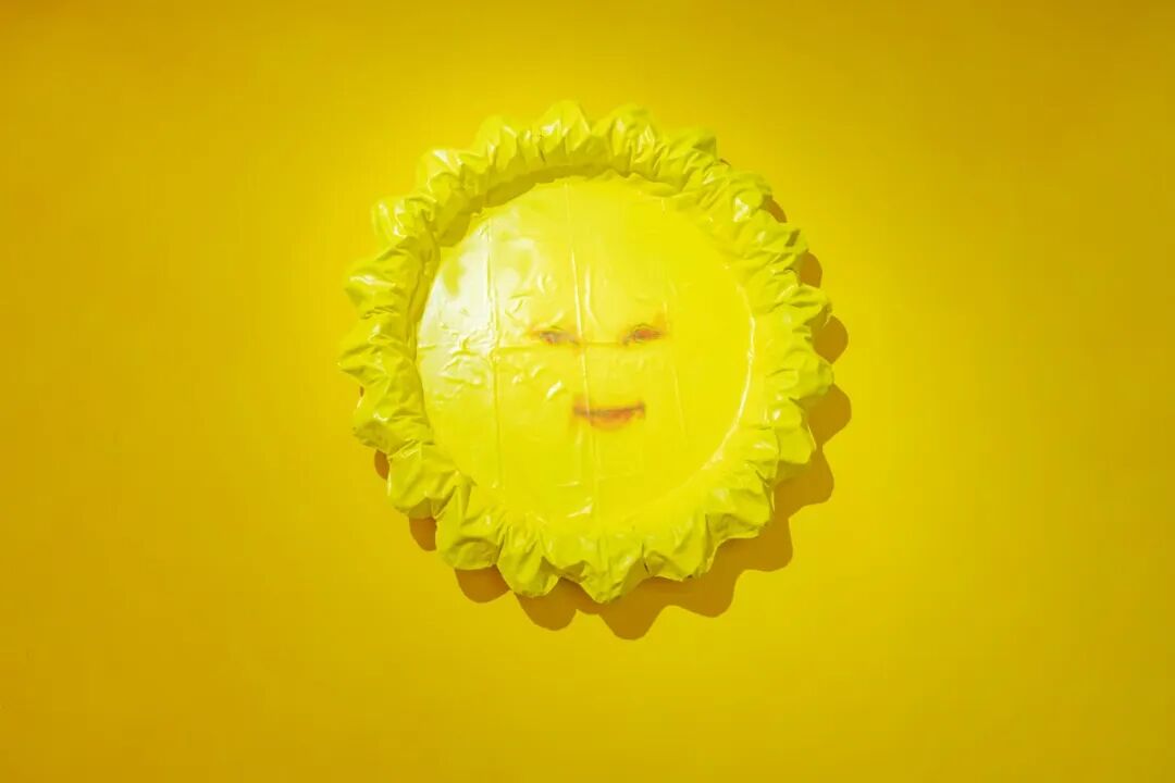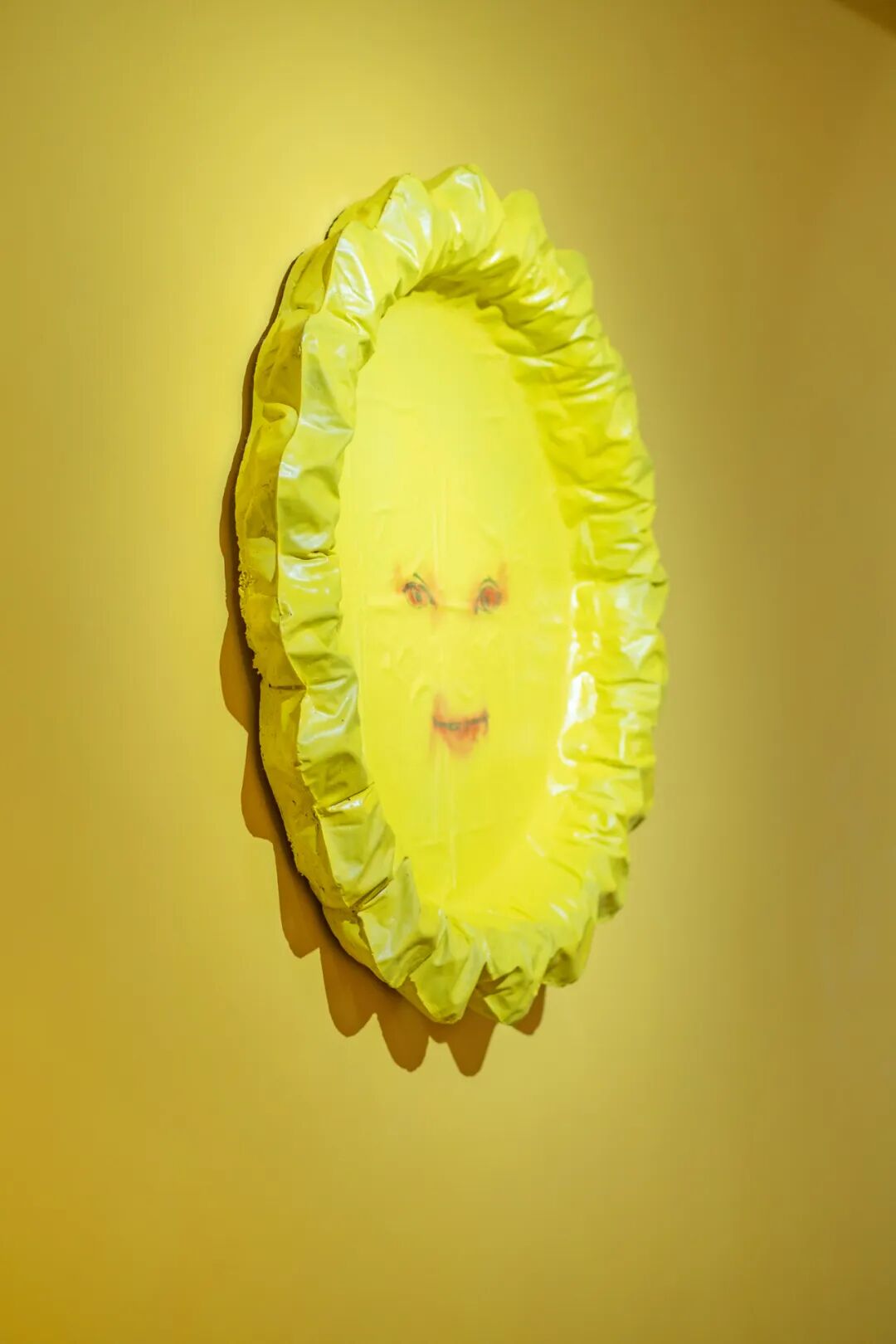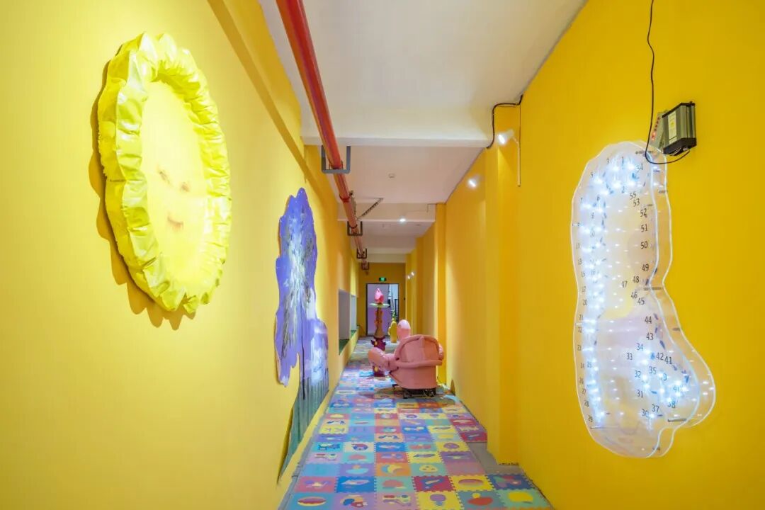 张听:《155CM》和《向日葵》是新的作品。《155CM》是关于一个小女孩的故事,我在展厅进门的地方放了一个PVC立牌,叫《花园男孩》,这个小男孩他有一个假想的喜欢的女孩,这个女孩的身高是1米55,这个作品的高度也正好是155cm,在这个作品上面有1-55个灯珠,它们会从第一个开始逐个点亮,像小时候的连点成线的画,把1到55连起来会发现是一个小男孩的剪影。《向日葵》是一个玻璃钢材质的充满褶皱的向日葵,我把充气儿童泳池放气放到一半的状态翻模出来,就会有种正在漏气的感觉,上面的褶皱和凹痕是我认为最有趣的地方。表面的那张画是我和冰洋相互交换的彩蛋,是他画的脸,上面是一个天线宝宝。