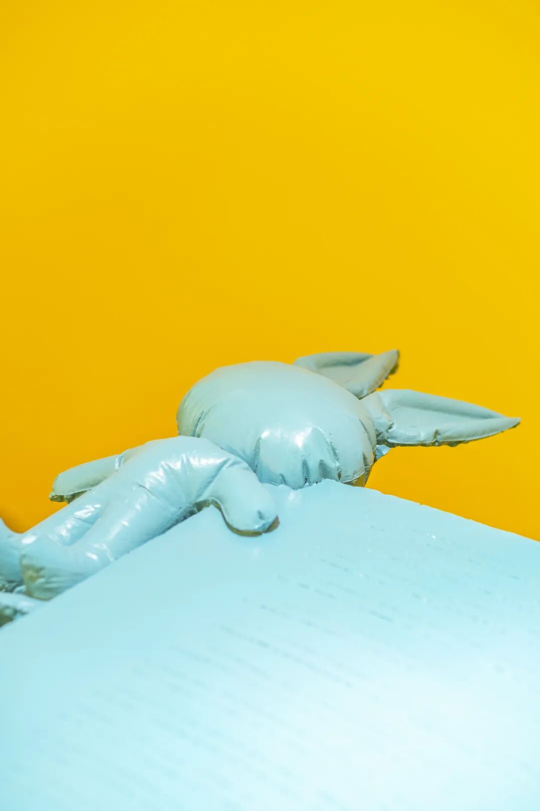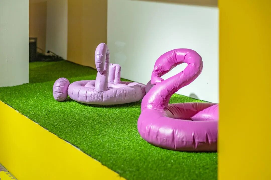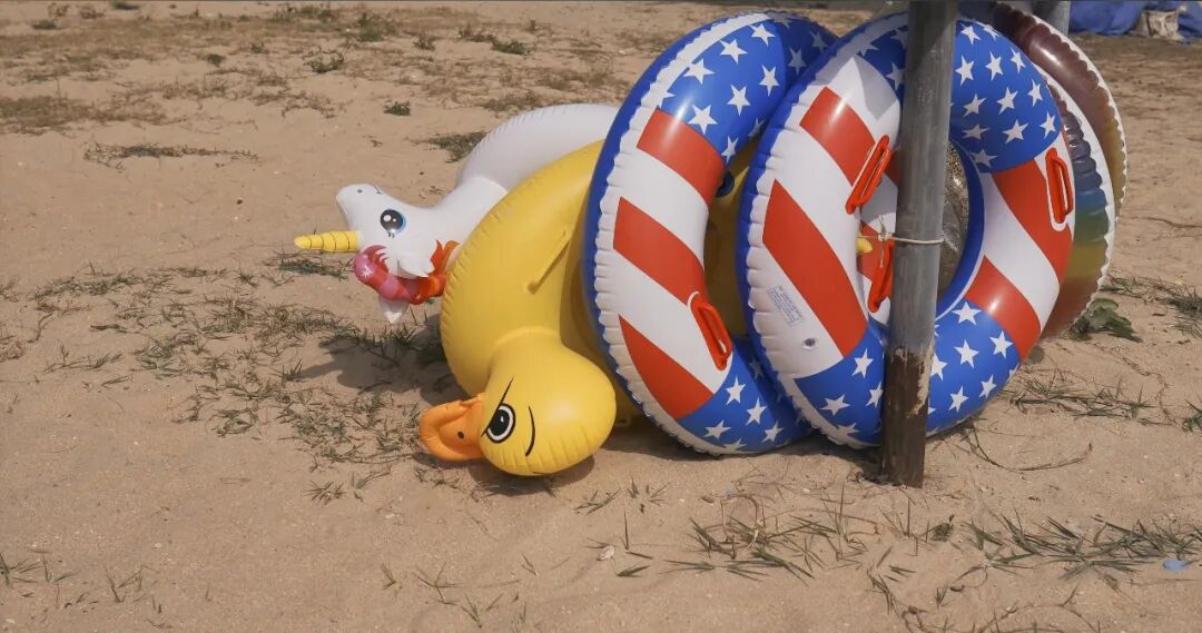 我想表达的内容一直是我对一代人的一种解读,一代人是指和我同龄的一代年轻人,我在他们身上看到了一种漏气的、想要充气却始终充不满的状态,这部片子是最开始的一种尝试。从20年开始我的创作中逐渐开始出现很多的气模形象,从最开始的充气火烈鸟,充气大黄鸭,再到后来的充气不倒翁,充气课桌等等。是因为我有一次在淘宝刷到了一个网红充气火烈鸟游泳圈,它的配文是“INS网红充气...”,我当时觉得这个东西讽刺的意味特别足。我使用这些塑料气模形象其实不是想要让大家感受到童年时期单纯的快乐,而是我觉得塑料气模可以与一代年轻人的状态产生挂钩。塑料气模它永远填充不满,总是会有褶皱,有可能填充的越满,褶皱越深。