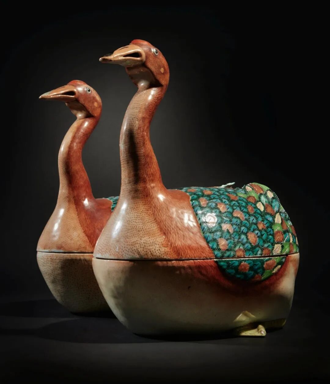 粉彩鹅形汤盆一对