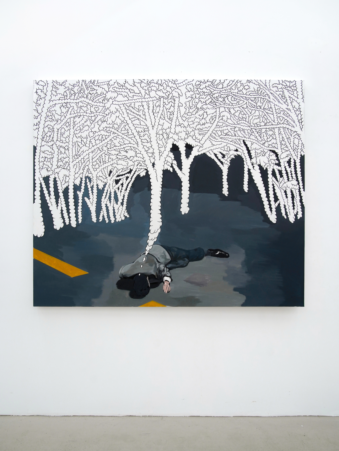 当无名的个体置身于具体的境遇,思想化为巨人,矛盾在此刻无比明晰:孤独个体的内心纠缠,两人关系中的利益与伤害…它是如此具体,却又如此宽泛。陈映舟的作品如同迷雾逼近观者,模糊、压抑的情绪深深的感染每一个观者。漫画式语言与剧场感构图的结合,让画面不受限制的涌动,正是这种失语和沉寂,让“脑内窒息”浸透在陈映舟的绘画里。