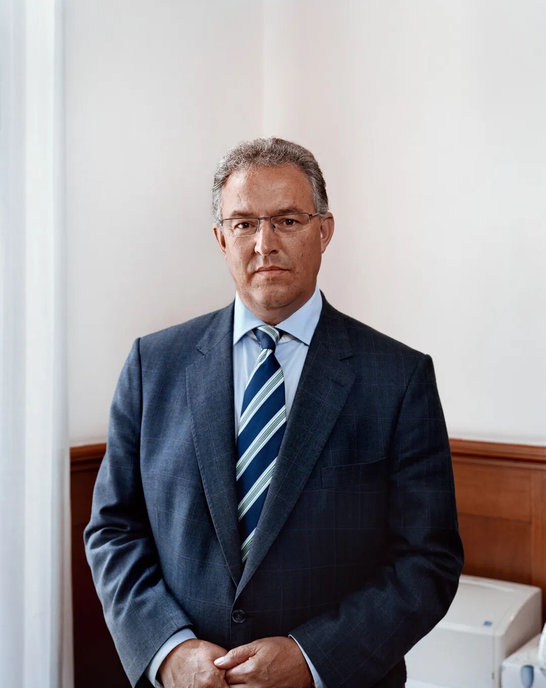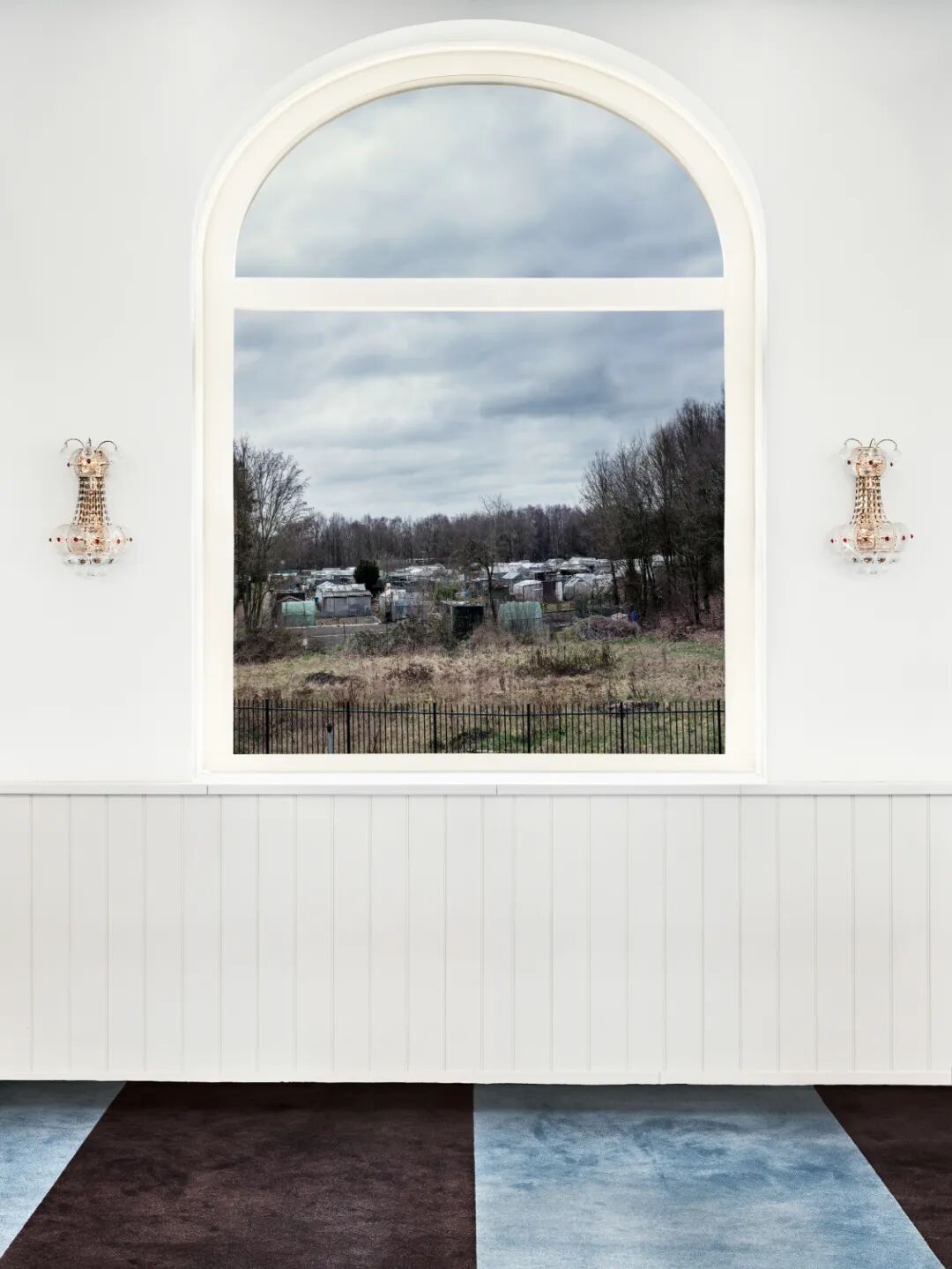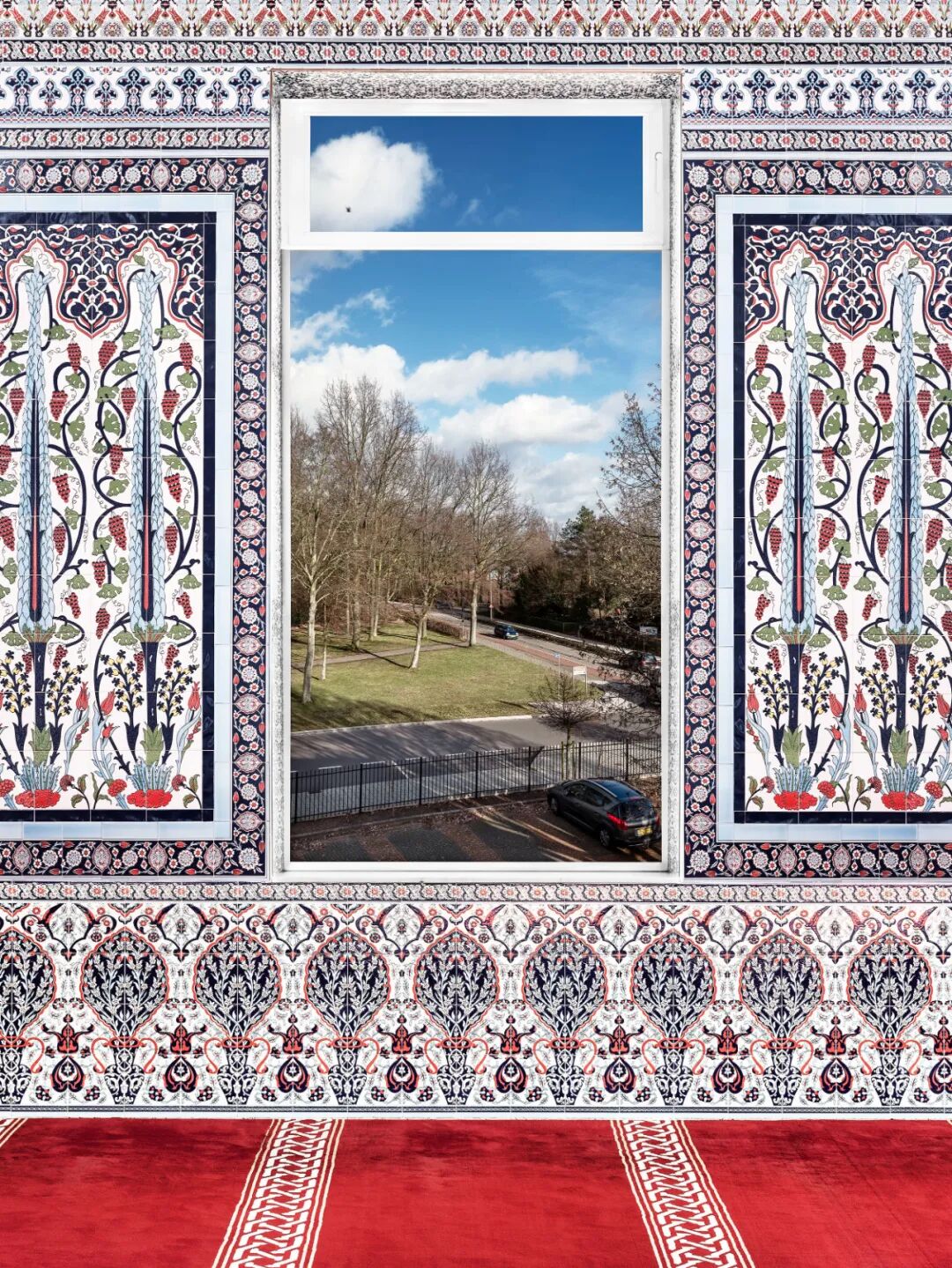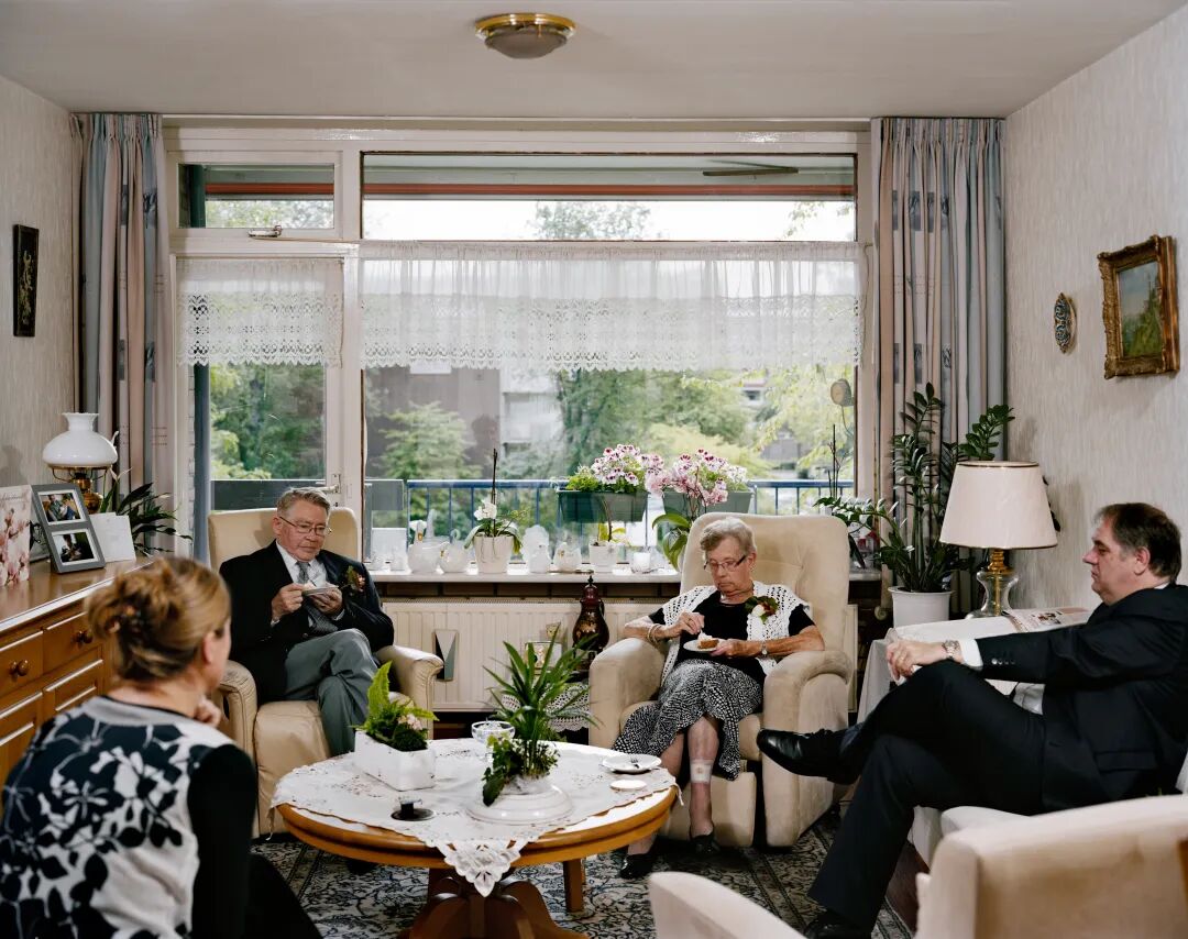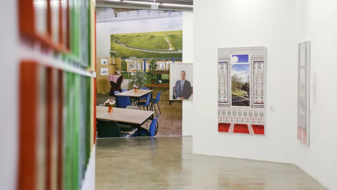 例如马万· 巴西奥尼(Marwan Bassiouni)在《新荷兰风景》(New Dutch Views)中,拍摄了作为少数群体的荷兰穆斯林礼拜场所窗外的荷兰风景,摄影师的取景框引导观众们跟随教徒礼拜时的目光从室内看向室外的城市天际线、乡村农田、公园草坪、基督教堂,等等。如果我们同意窗外的景观是典型的荷兰视觉经验,其内容被固定为简洁、抽象、少矫饰的现代风格以及经过现代化改造的有序自然,那么室内繁复细致的马赛克瓷砖,充满曲线、色彩艳丽的植物纹理以及复刻了伊斯兰建筑风格的拱门装饰则沿袭自历史悠久的伊斯兰视觉传统。巴西奥尼构建的这种美学上的强烈对比,突出了荷兰穆斯林的宗教精神空间与社会公共空间之间的紧张关系。对社会空间的再现同样可见于黛娜·利申博格(Dana  Lixenberg)的作品《市长》(The Mayor)。在接到委任拍摄荷兰市长肖像的过程中,利申博格将目光对准了那些不曾被大众广泛看到的市长办公室、会客厅、餐桌,等等,那些被她称作“日常的剧场”(the Theatre of the Everyday)的场景。利申博格发现,几乎每个市长的桌上都放着茶包、糖和奶粉 。这是一个时刻为公共对话作准备的空间。与巴西奥尼内外矛盾的礼拜堂照片相比,这些典型的荷兰设计风格的杯盏、装饰物与窗外景观和谐一致,进一步从视觉上确立了其中心地位及其背后流动的权力话语。这两组作品所呈现的室内与室外,在彼此的映照下体现出荷兰社会中普遍存在的主流与边缘的空间政治叙事。