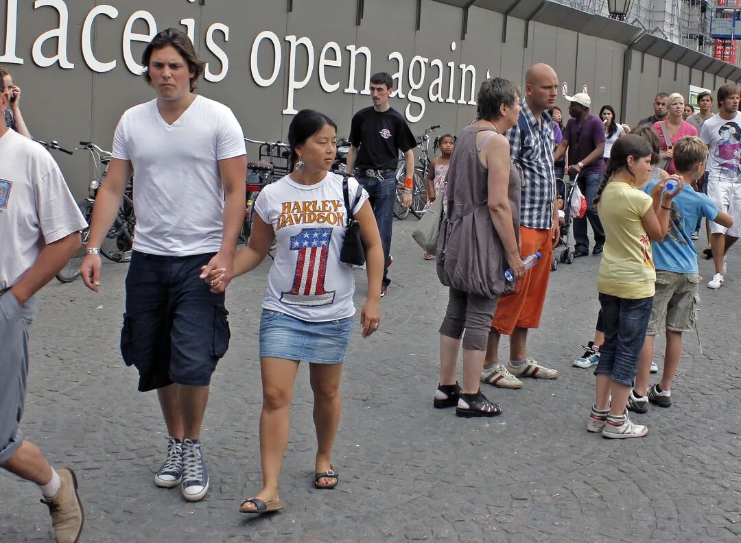 从20世纪70年代就开始活跃的艺术家汉斯·艾克尔布姆(Hans Eijkelboom)是欧陆观念艺术的领军人物,其一以贯之的街拍手法充满了独特的研究意味和人类学视角。他是一个游荡在街头、人群中的观察者和思考者,而摄影是他最得心应手的语言。创作于2011年的《数字中的阿姆斯特丹》(Amsterdam By Numbers)是一件轻松幽默而又以小见大的作品。在阿姆斯特丹街头寻找并拍摄身上有数字1到100的人,通过制定这一规则,艾克尔布把摄影的程序变成了一款现实中的寻宝游戏。这与前文提到的卡瑟斯的作品有异曲同工之妙,被相机对准的对象并非作品所表达的,真正的意涵被藏在了轻松的话语背后:观看者解谜的过程才是趣味所在。幽默、具有游戏性、以生活中的细节切入并关注具体的人,这样的特征的确符合我们对于荷兰人的一般印象。我曾与几个生活在荷兰的创作者聊起哪个词最能代表荷兰人的性格,大家不约而同地想到了一个日常语境中经常用到的英语单词“chill”,我将它翻译为“率性而为、随遇而安”。从一定程度上来说,在街头游走、观察、收集是十分耗费时间且无法保证收获的事情,如同猎人。哪怕漫无目的也不觉得浪费时间的好心态的确会更容易催生出轻松、幽默而生活化的作品。当然,这种风格既不是荷兰摄影的特例,荷兰摄影也并非全然如此。(当我在如此形容的时候,就已经在强化一种既定的刻板印象了。)