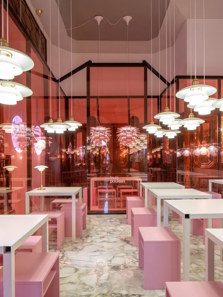 Louis Poulsen将一家著名的咖啡馆改造成了淡玫瑰色,顺便推出新的PH Pale Rose系列家居用品。