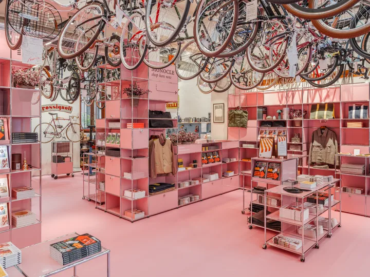 在布雷拉的Rossignoli自行车店,一场由USM(USM 成立于 1885 年,是一家瑞士家族企业,以为办公室和工作空间量身定制的家具系统而闻名。)与Monocle合作的全粉色布置正在展出。