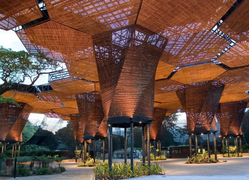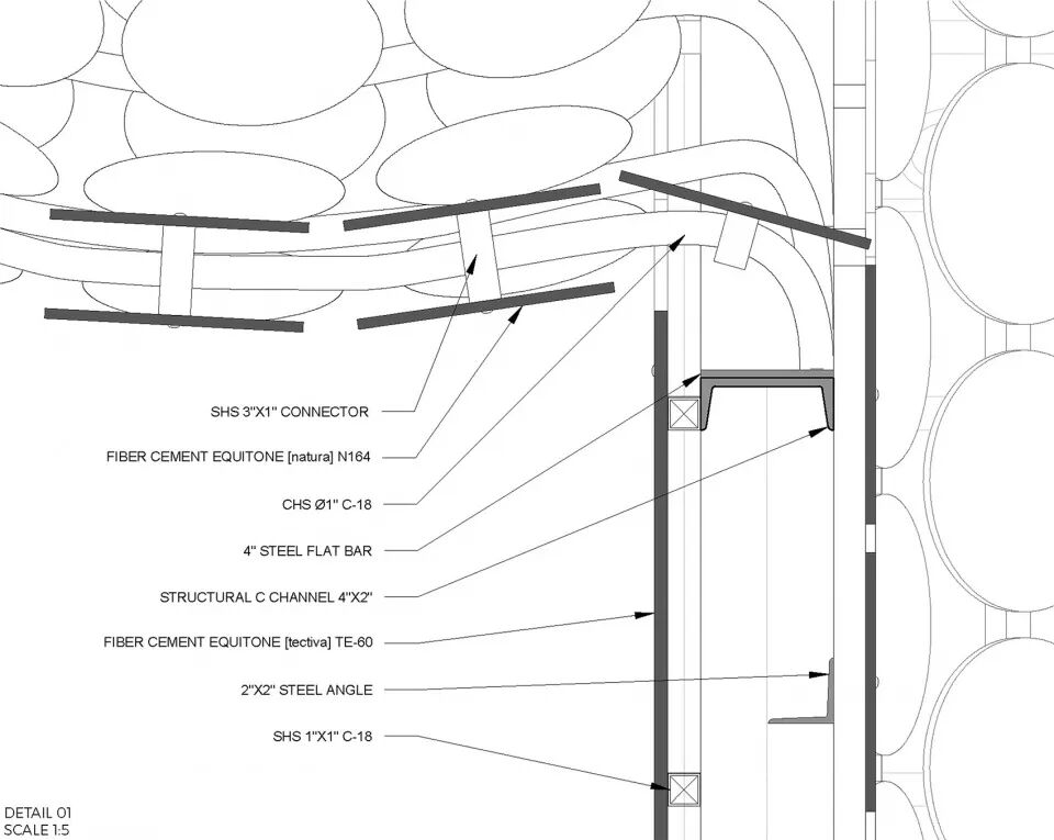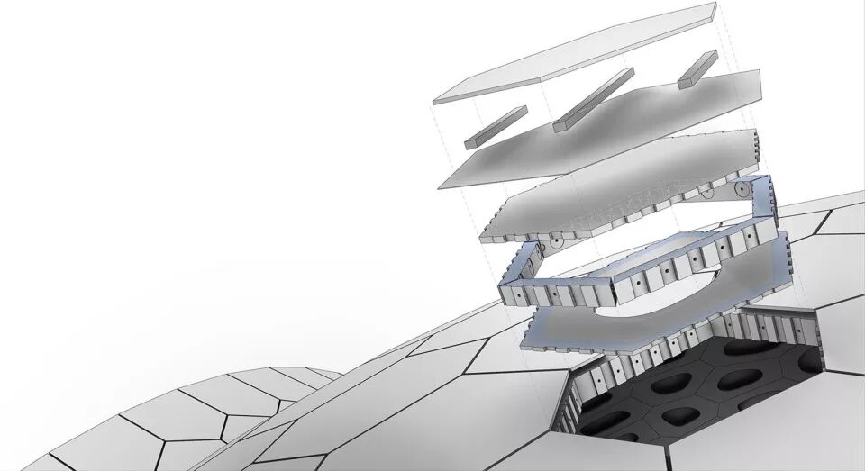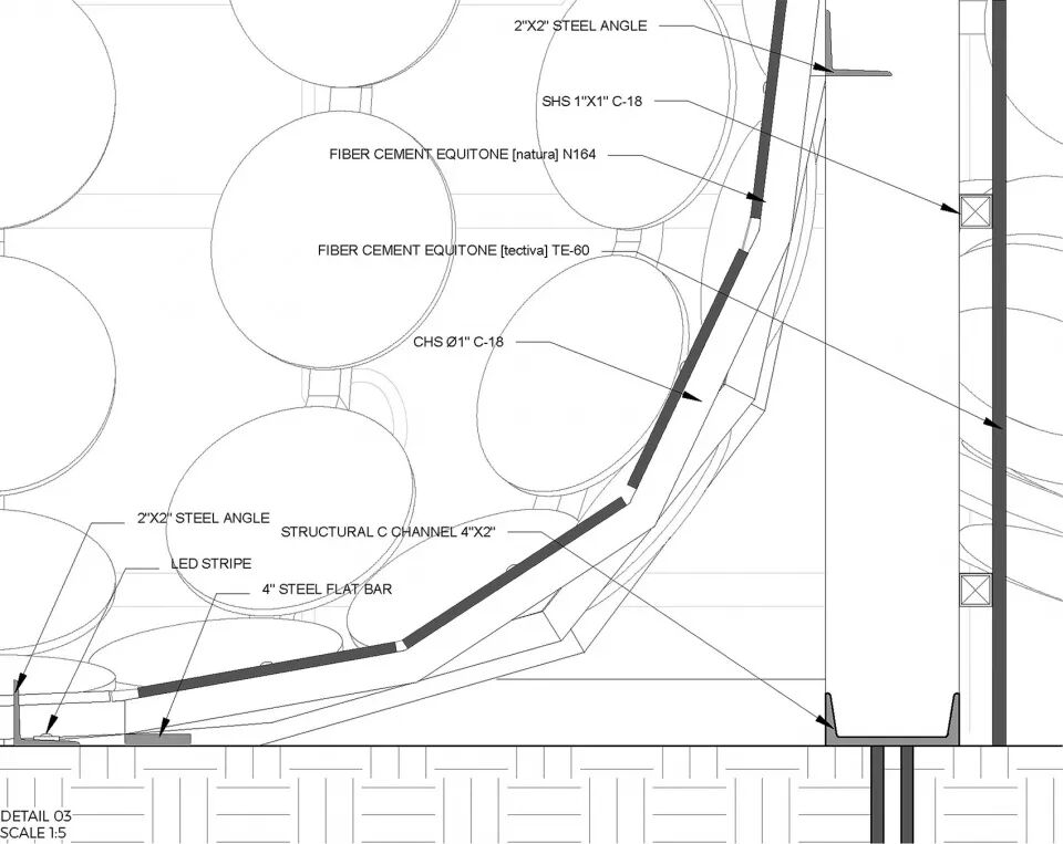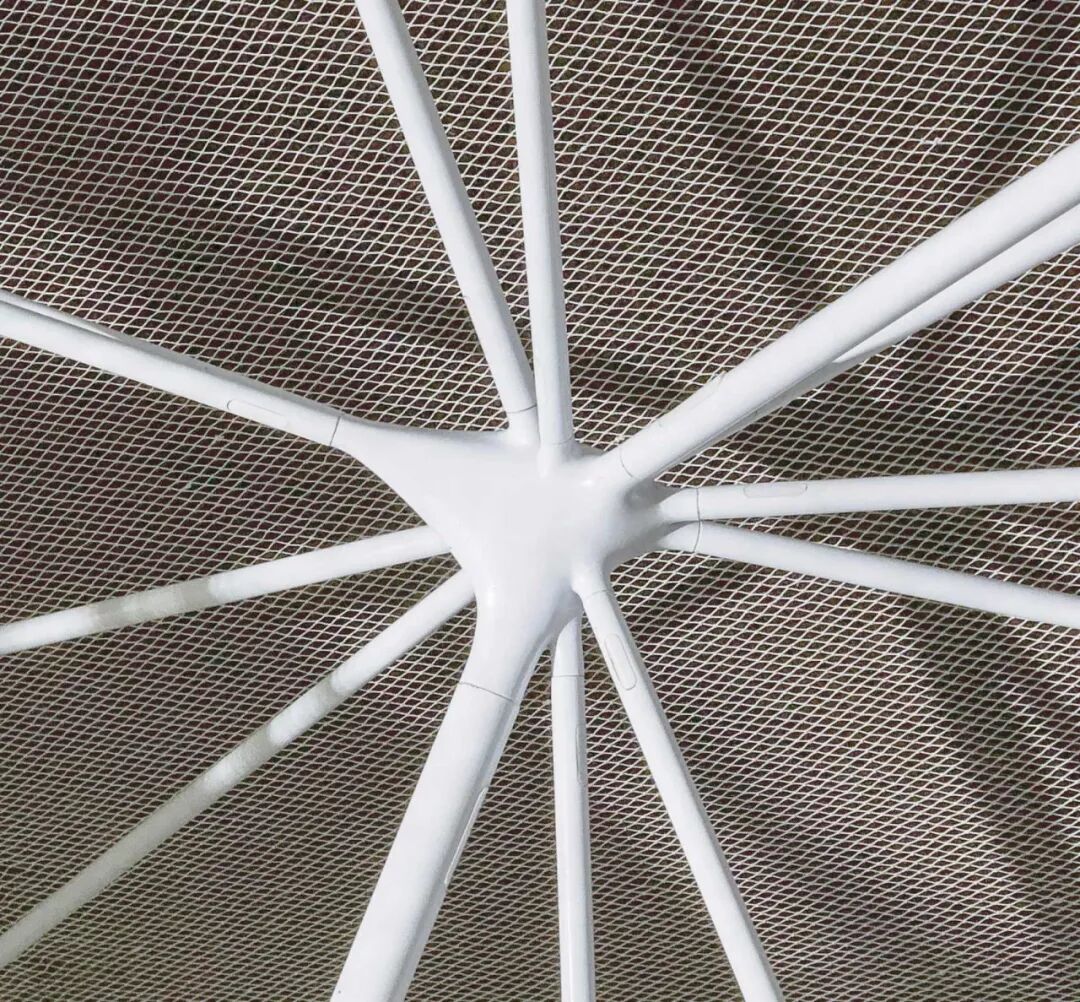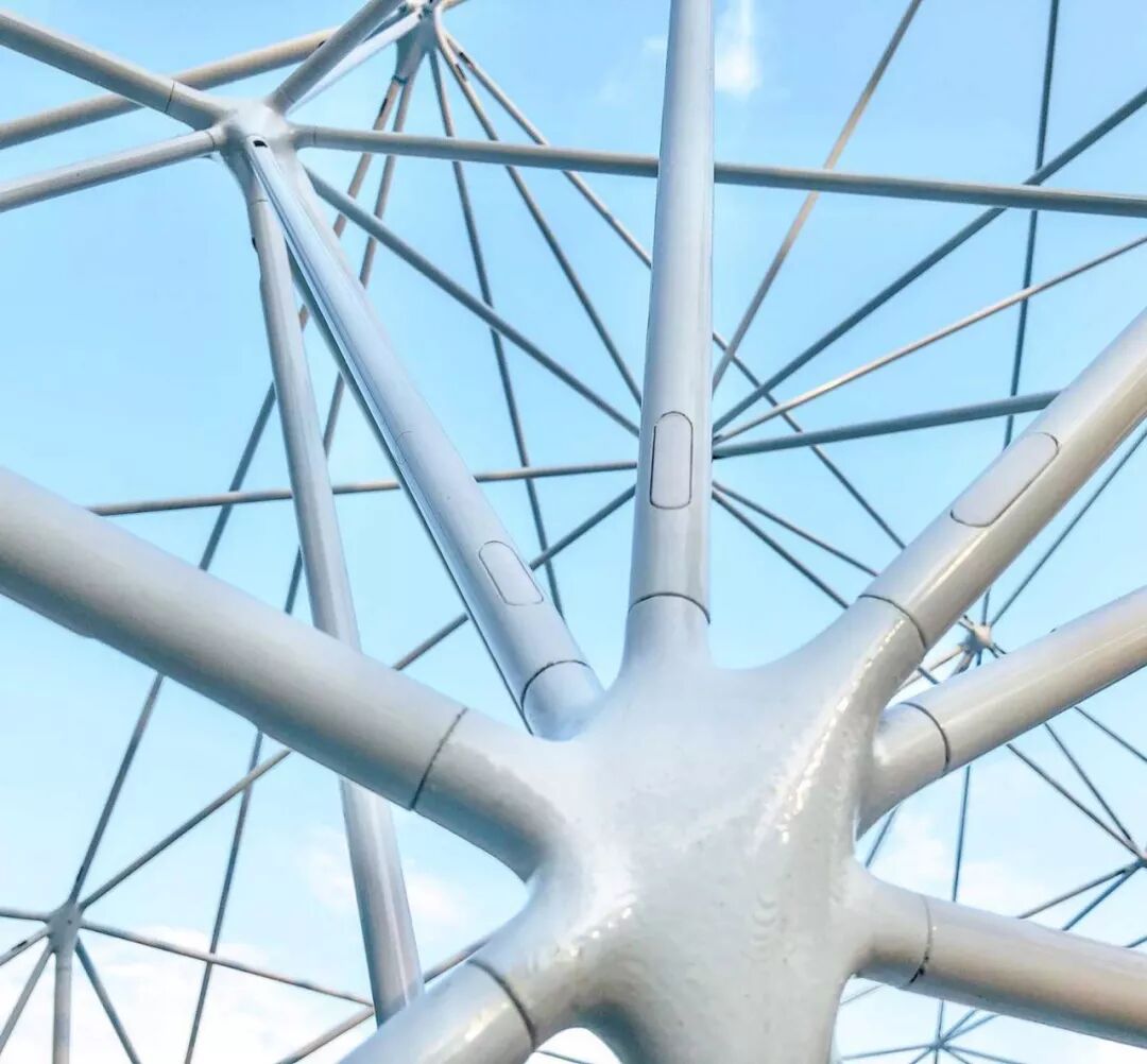 ▼7根钢柱的顶部,顶棚原木集束在六角形耐候钢模块结构的圆孔中