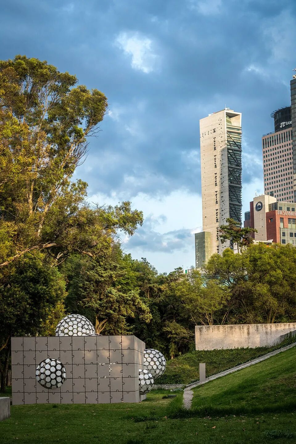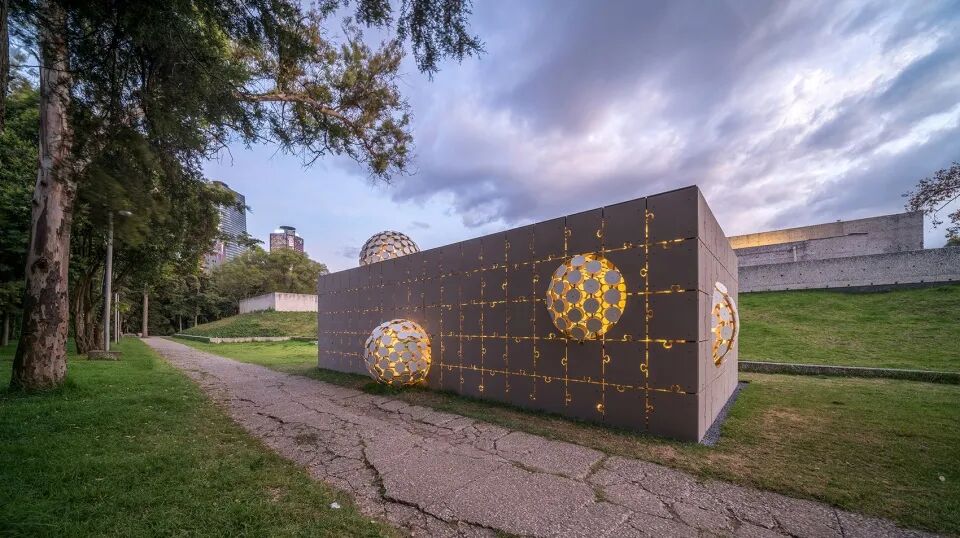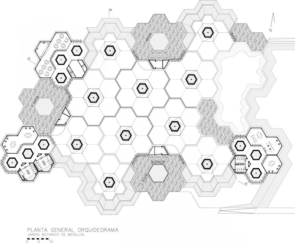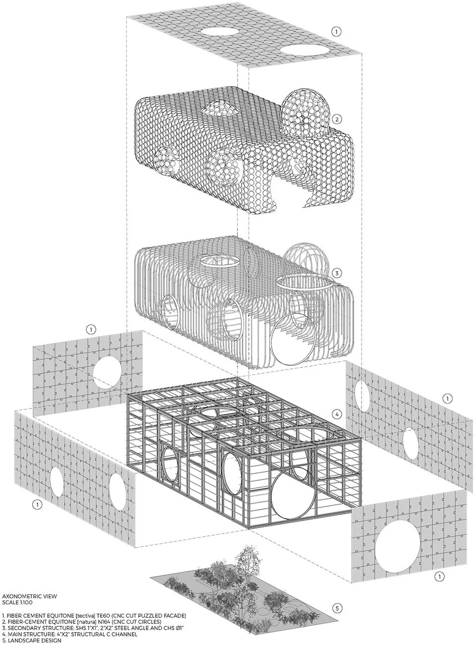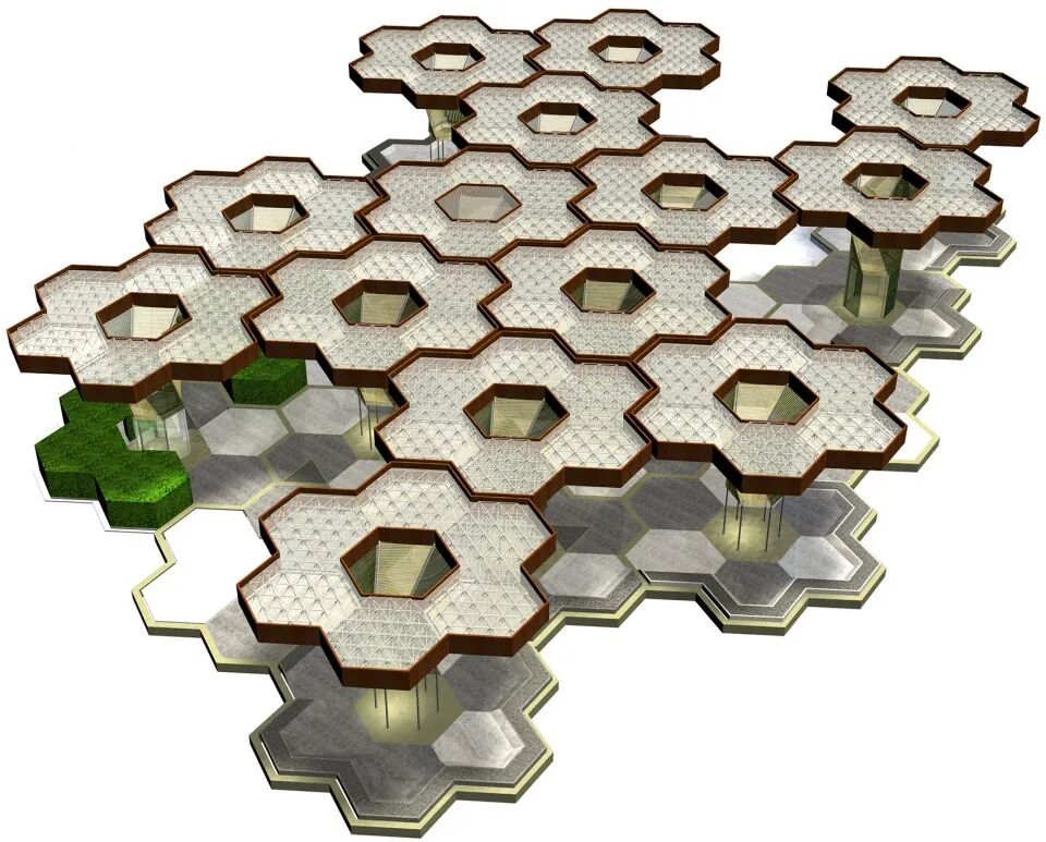 ▼7根钢柱的顶部,顶棚原木集束在六角形耐候钢模块结构的圆孔中