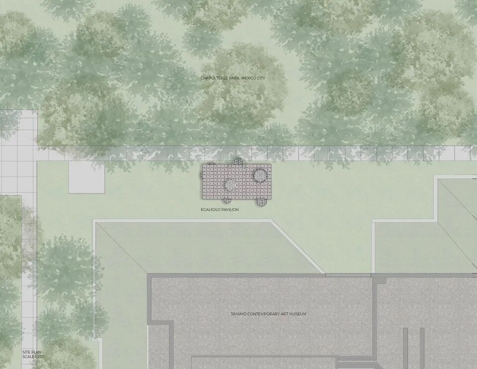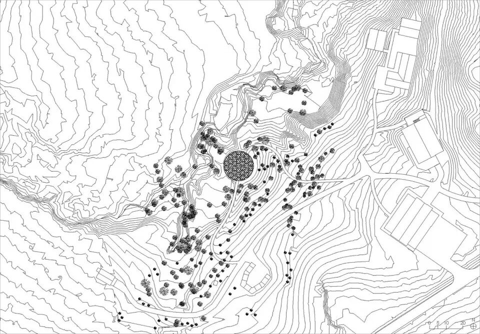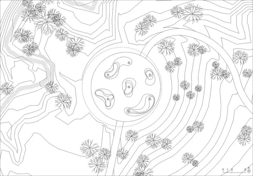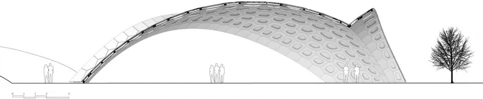 ▼顶棚上部表面被塑造成弯曲的形状,形成一个与周围山丘融为一体的圆形形态