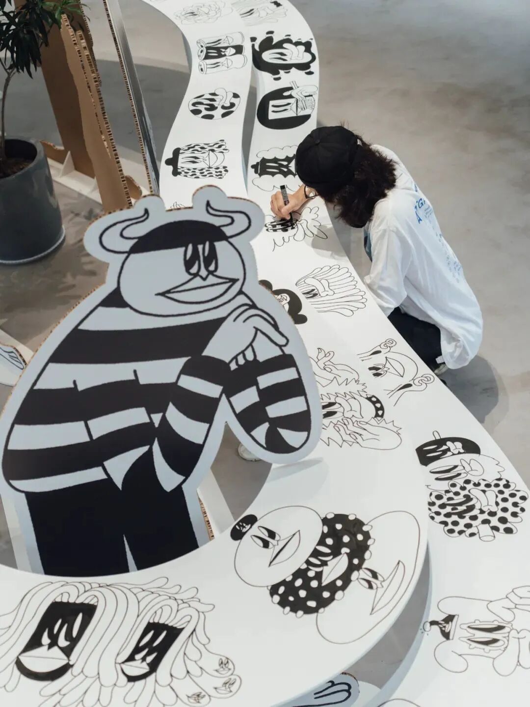 在郑州站展览期间非常受欢迎的 LALA COMPANY 家族瓦楞纸装置作品,将会以更多数量、更多造型、更大展示面积降落成都站展览,在书店的不规则水泥台阶开启 LALA COMPANY 的家族大派对。