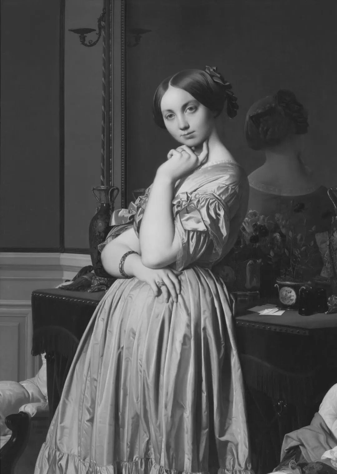 比如我们可以看安格尔的这张《路易斯·奥松维尔伯爵夫人》:类似的色调下,同样是有光感的表达,但是安格尔的画面拿掉色彩关系以后光影依旧是完整的,这是因为它的光影是用明度塑造的。