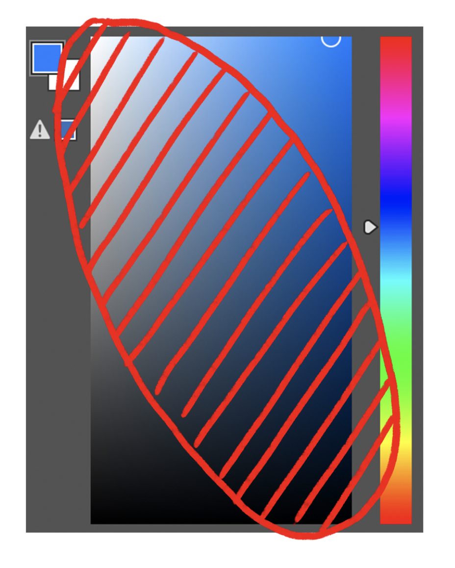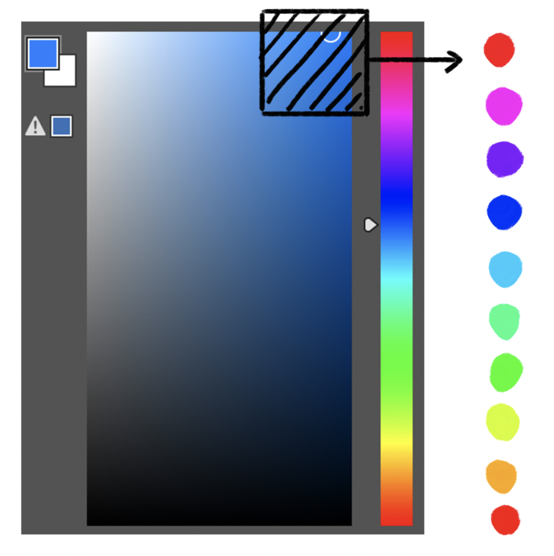我经常会跟同学们说警惕使用饱和度高同时明度也很高的颜色,也就是调色盘最右上角的颜色(这往往也是新手最喜欢使用的颜色)。