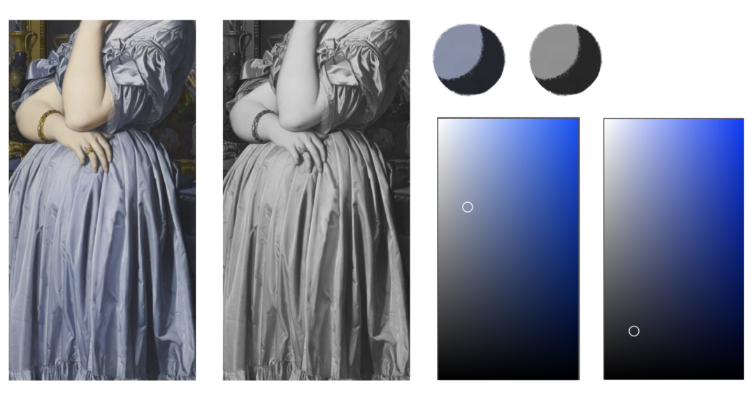 在上图中,右边两张图分别是原画的明度图和饱和度图:明度图(右上)的概念很简单,明度越高颜色越浅,明度越低颜色越深;而饱和度图(右下)的黑白色块有些不同,饱和度越低则颜色越深,饱和度越高则颜色越浅