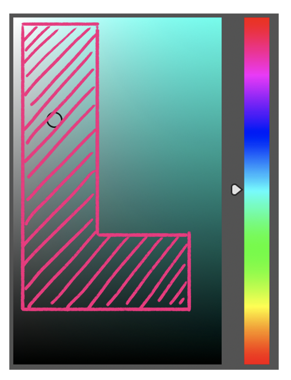 你只需要把选色器固定放在色彩立方体的某一位置或在这个位置稍做移动(注意基本上是在下图红色方框区域内选择定点位置,即选择一个饱和度比较低的颜色/明度较低的颜色饱和度可以容纳的更高