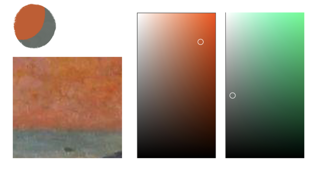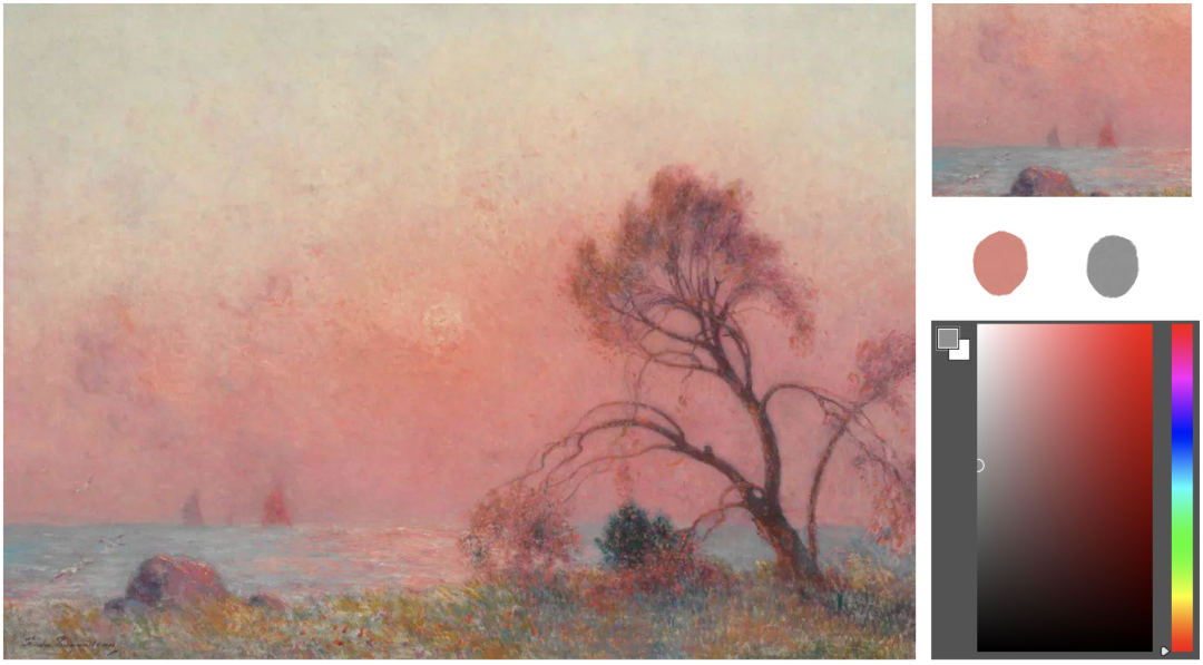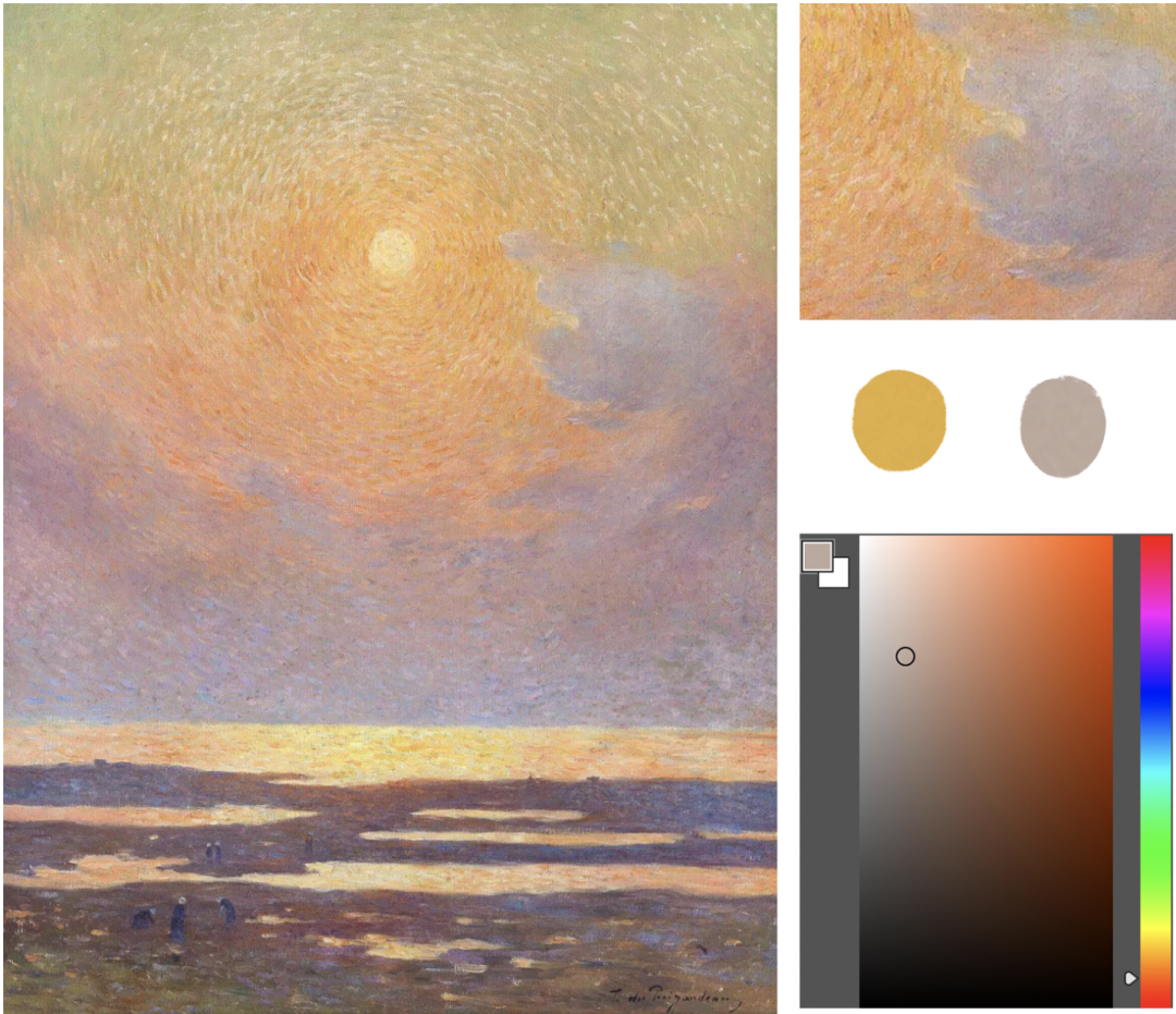 但如果你把这些图放大或是有机会近看原作,你会发现在某一片看似和谐统一的大色块下,藏了许许多多不同颜色的笔触,它们甚至都不是相邻色,就连我们平时认为的非常扎眼的互补色也能很好的融为一体。