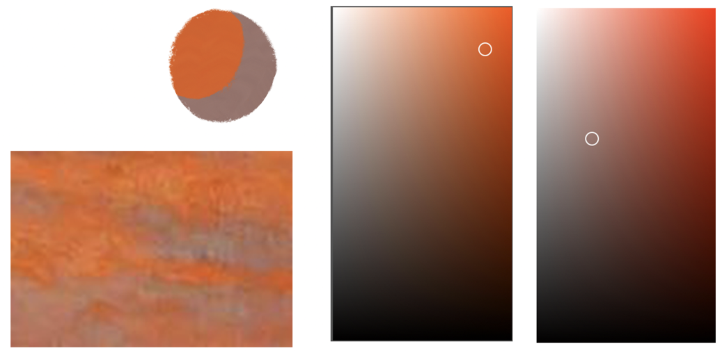 使用ps吸色工具以后我们发现高饱和高明度的橙色确实是亮部没错,但暗部颜色的色相居然是红色!
