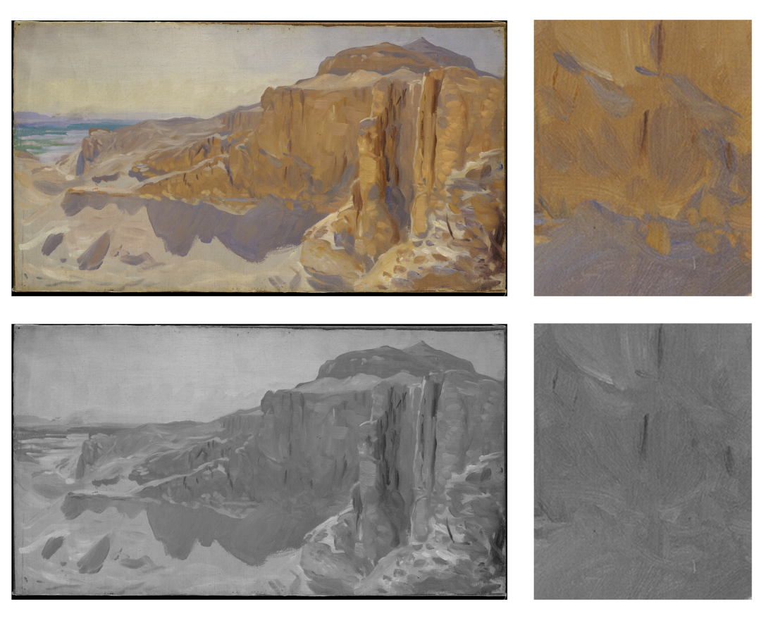 最后我们再看一张萨金特使用这种特殊色彩光影手法的画:在这座山上,有明确的金黄色和紫色的光影变化,但是去掉颜色,黑白稿中山上的光影居然消失了。