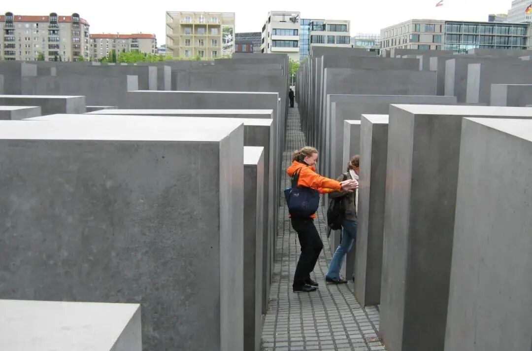 整个建筑群没有主要出入口,参观者徜徉在水泥块间由小方砖铺成不足1公尺宽的狭小通道,踏在同样是波浪般起伏的地面上,无论向上方仰望,还是环顾前后左右,人们感受到的是某种难以言喻般被冰冷的水泥石块挤压的窘迫。