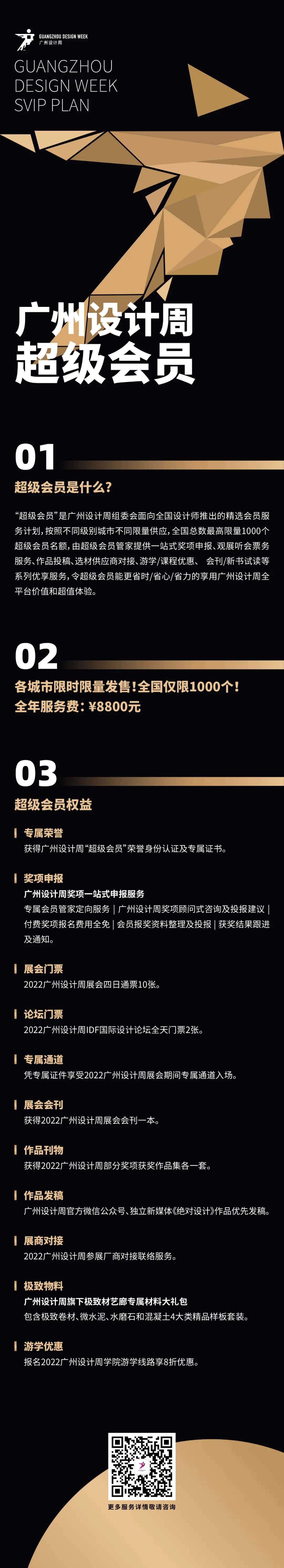 “超级会员”是广州设计周组委会面向全国设计师推出的精选会员服务计划,按照不同级别城市不同限量供应,全国总数最高限量1000个超级会员名额,由超级会员管家提供一站式奖项申报、观展听会票务服务、作品投稿、选材供应商对接、游学/课程优惠、会刊/新书试读等系列优享服务,令超级会员能更省时/省心/省力地享用广州设计周全平台价值和超值体验。