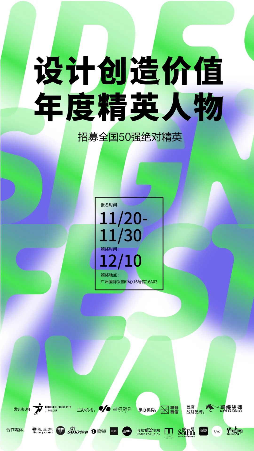 “设计创造价值·年度精英人物” 评选由广州设计周于2016年发起,2021年,由广州设计周联合绝对设计、广东和智有信共同举办,玛缇瓷砖首席特约合作。本评选旨在向社会注入新设计观、新价值观、新文化观,提升民生生活价值、增加商业品牌价值和贡献城市发展价值。以表彰以观念创新带动产业升级发展,为国家创意产业塑造创新发展模式,为中国设计跨越式发展树立“样板工程” 的精英设计师。