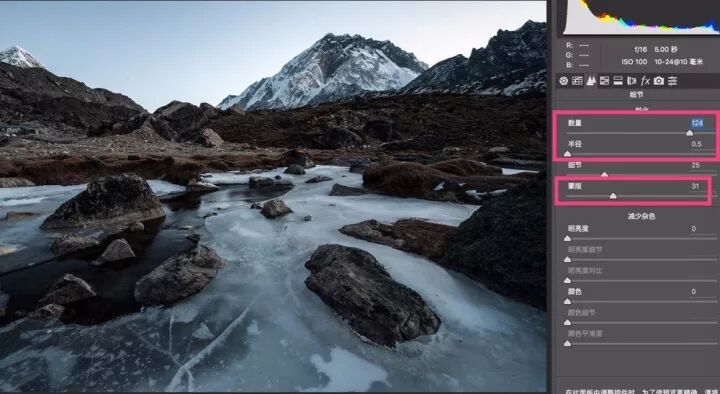 当然,局部调整是后期的核心。上面锐度清晰度的强化,不仅增加了冰面的质感,也强化了远处乱石堆的细节。因此需要用蒙版,把画面中的其他地方遮住。