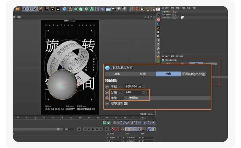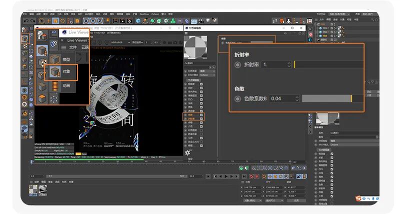 03-添加OC透明材质,给到球体,色散参数改为0.03,索引值改为1;这个时候可以去调整一下球体位置,大概效果就出来啦,再去改变模型厚度让他变成扁的效果会更好哦!(用对象模式可以不用C掉物体直接变形哦)