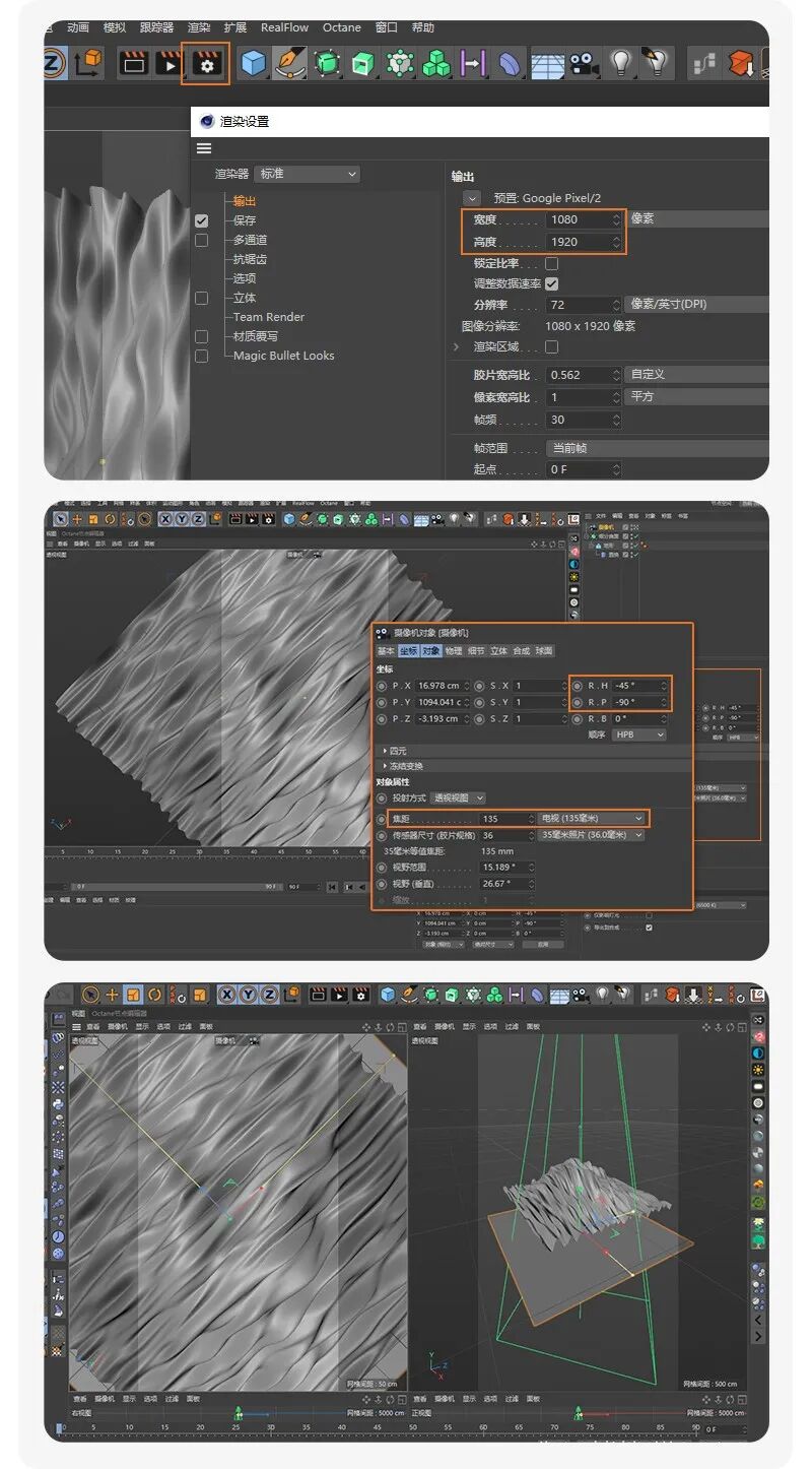 04-调整输出尺寸宽高1080*1920;新建摄像机,焦距改为135毫米,旋转参数H/P改为-45°/-90°;添加平面到地形下面,旋转地形45°;再在地形下面添加一个稍微大一点的平面