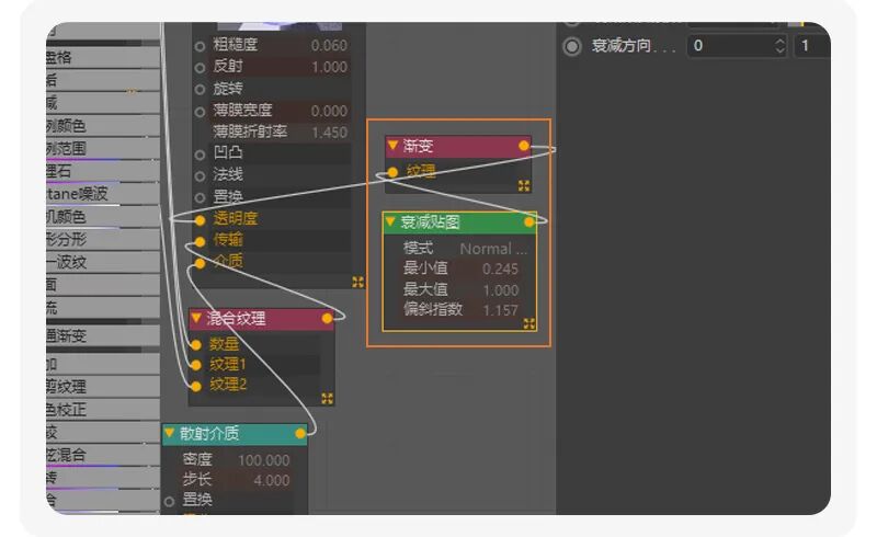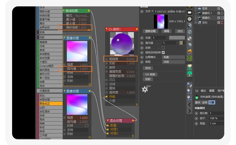 03-再新建添加透明材质,粗糙度0.06,找一张喜欢的炫彩图连接到传输上面去,利用混合纹理(纹理1伽马值给到1)和衰减贴图(偏斜指数给到1)再让彩带边缘更透一些