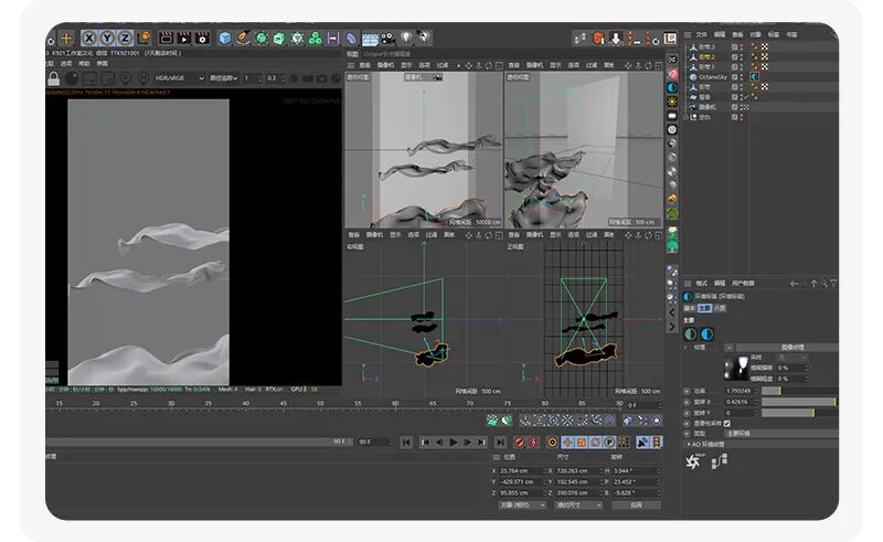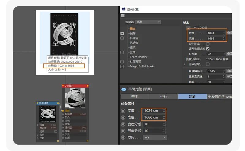 01-新建平面,再新建OC漫射材质导入海报,根据海报尺寸设置渲染尺寸和平面尺寸