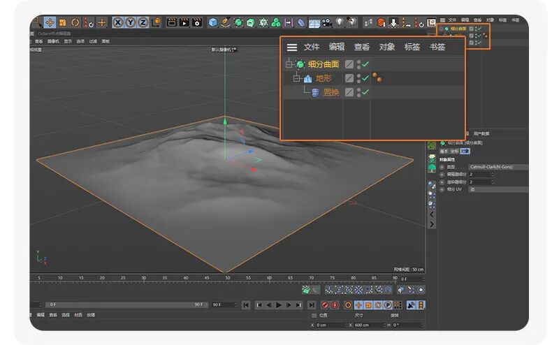 01-首先新建地形,添加置换变形器为地形子集,并且加上细分曲面。