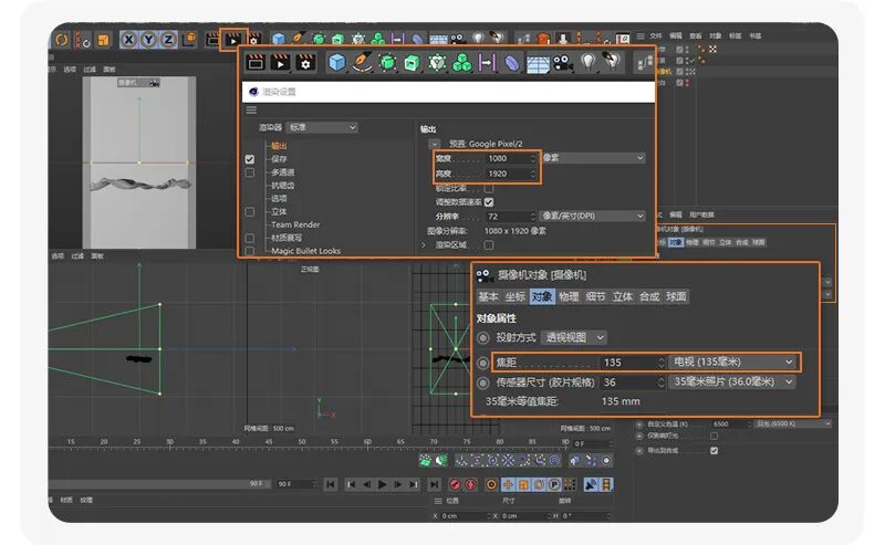 01-添加一个平面做背景板,设置好输出尺寸(1080*1920),摄像机角度(焦距135mm/正面视角)