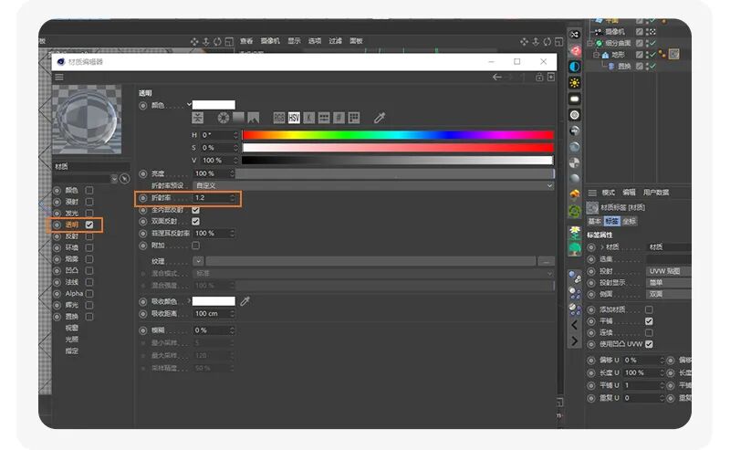 01-添加C4D默认材质,只要透明通道,折射率1.2,给到地形