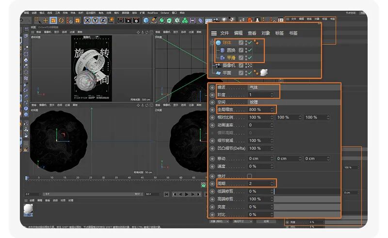 02-添加置换效果器为球体子集,置换的着色器里添加噪波,进去后噪波形态改为气体,阶度改为1,全局缩放800%,周期为2;再添加平滑效果器到置换效果器下面