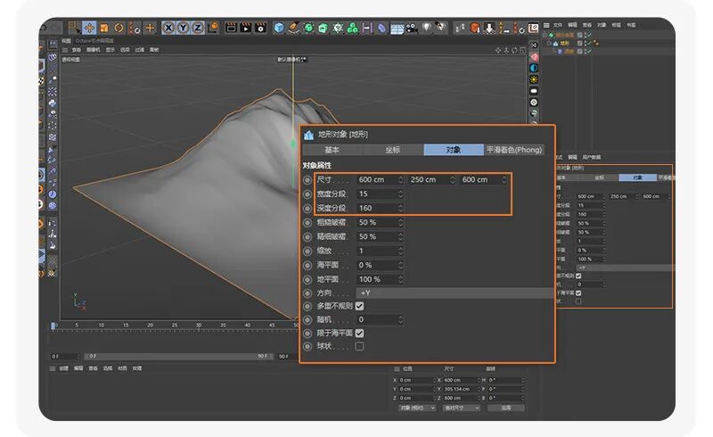 02-地形尺寸修改为600/250/600,宽度/深度分段修改为15/160