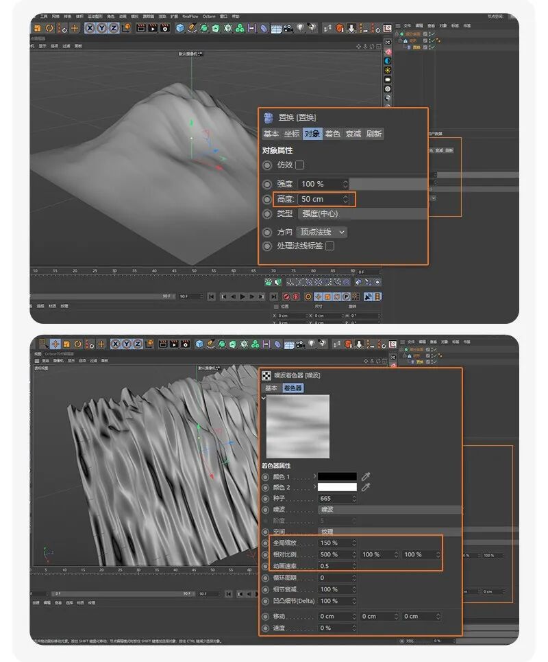 03-置换效果器的对象-高度改为50,着色器里面添加噪波,进去后全局缩放改为150%,相对比例改为500/100/100,动画速率0.5,播放动画后选个满意的画面停下来即可