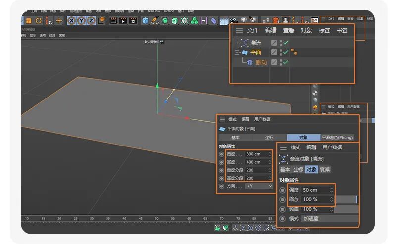首先我们先拉出一个长宽800*400的平面当做彩带,分段各200;再给平面添加颤抖效果器为子集,再添加湍流力场,强度50、缩放100