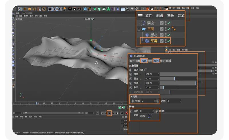 02-把湍流力场拉到颤抖的影响里面,对象-高级-弹簧值0;给平面添加平滑效果器,层级放到颤抖下面;这个时候就可以按下播放键,可以看到平面动起来了,我们选一个画面暂停后把他C掉