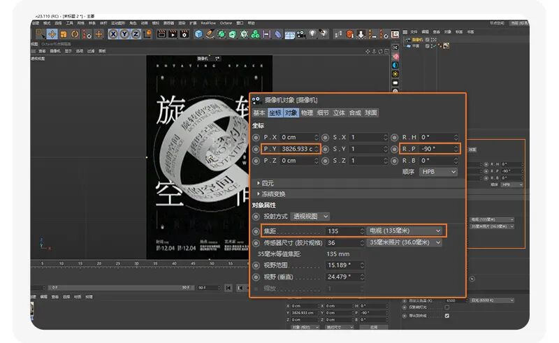 02-设置摄像机坐标旋转P为90°正对着平面,拉开距离Y达到合适的参数,其他坐标参数为0,焦距用135毫米,视角不容易变形