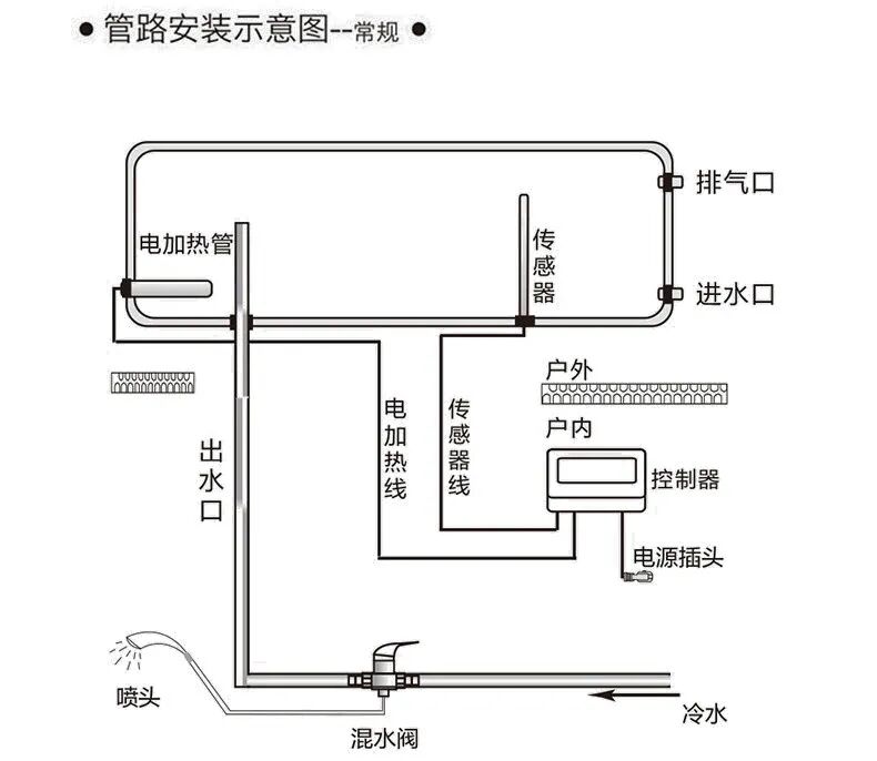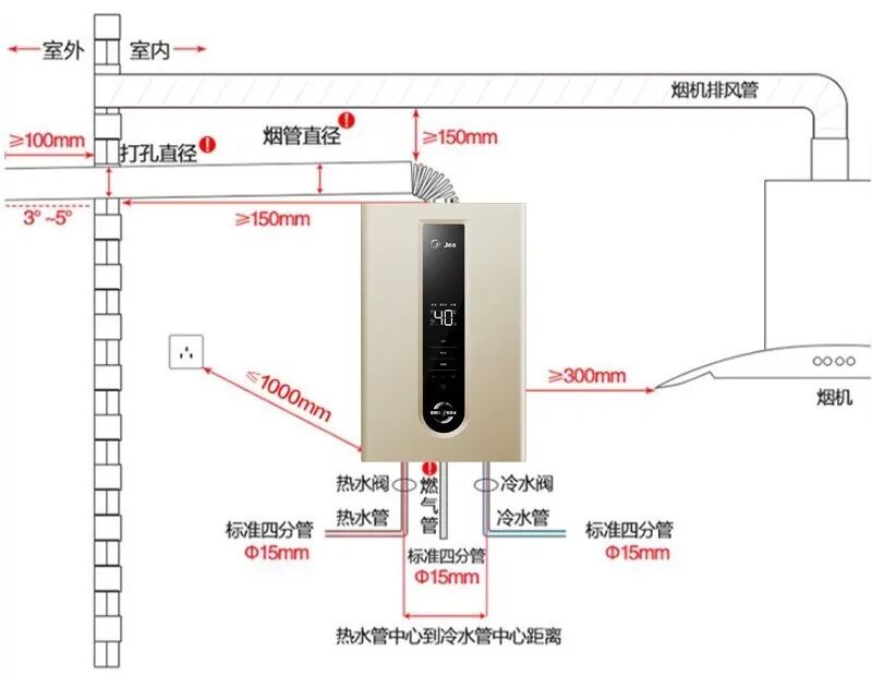 燃气热水器常装在厨房和阳台,重点要考虑预留的安装位置尺寸是否足够。燃气热水器接管参考如图所示。