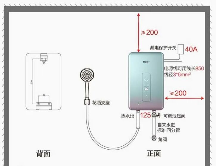 家用储水式电热水器容量一般为60~80L,因为有一定重量,尽量不要安装在新砌薄墙上。