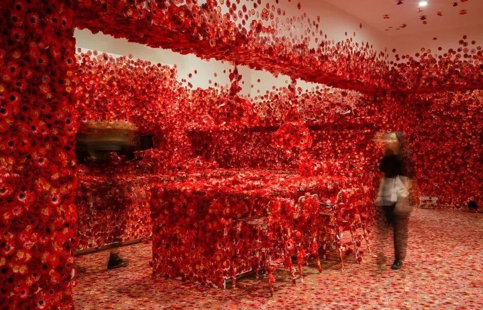 这是日本艺术家草间弥生为维多利亚国立美术馆首届三年展创作了一个极具互动性的装置作品《Flower Obsession》(花痴),艺术家将兴趣点交给参观者,邀请观众进入展区,并自由地在任何表面贴上红色雏菊的贴纸。
