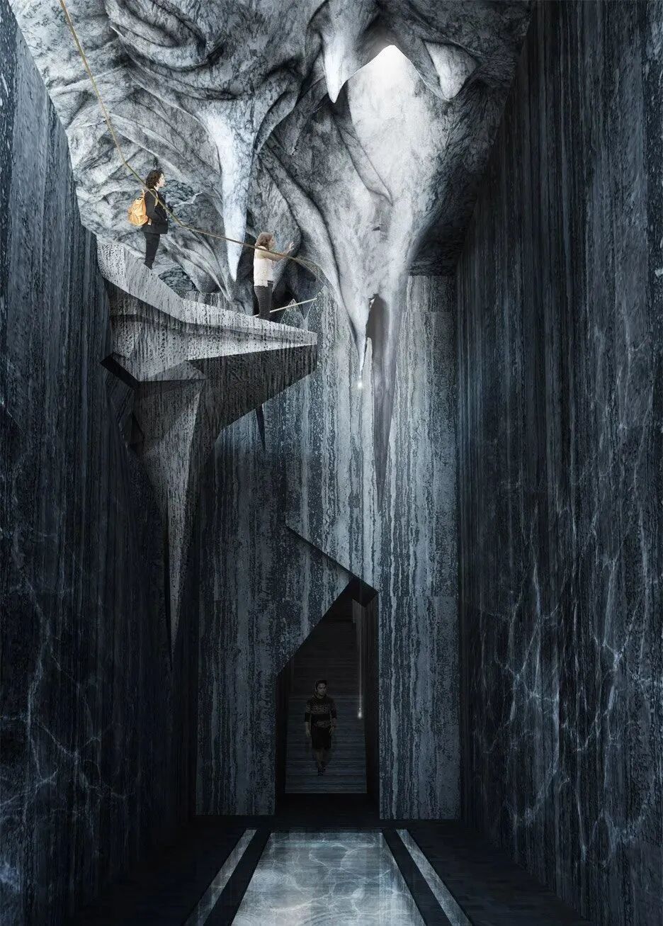 由于采石场的特殊位置,设计师将开口和靠近地表的区域开凿出了一系列空间。