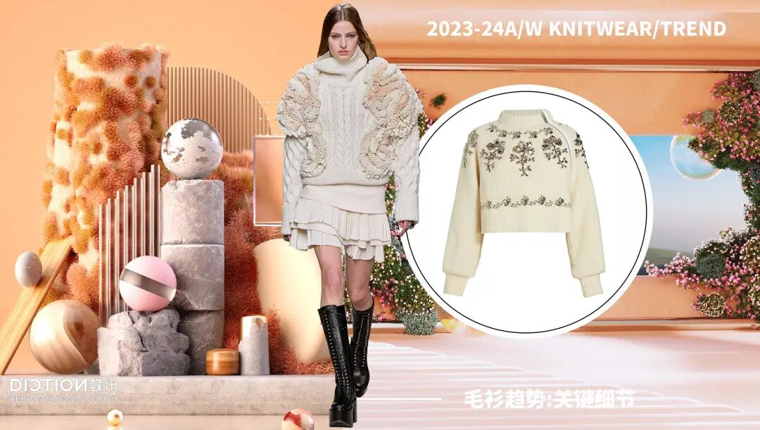 2023/24秋冬 毛衫趋势:关键细节 本内容已在 DNEXT 上线 蝶讯会员无需付费阅读本文章 请登录女装频道【趋势预测】栏目查看 欢迎非会员读者朋友付费阅读 关键趋势 ——————— Key Trends  ——————— 关键词:性感修身、不对称设计、层次结构 设计要点:受到Y2K千禧风时尚回归的影响,利用柔软贴身的针织基础 单品,可考虑截短露肤比例和富有变化的肩部叠加镂空设计。同时灵活 的模块化设计也是年轻世代乐于尝试的搭配方式,可满足他们跨季和层 搭的需求,呈现更为丰富有趣的外观表现。