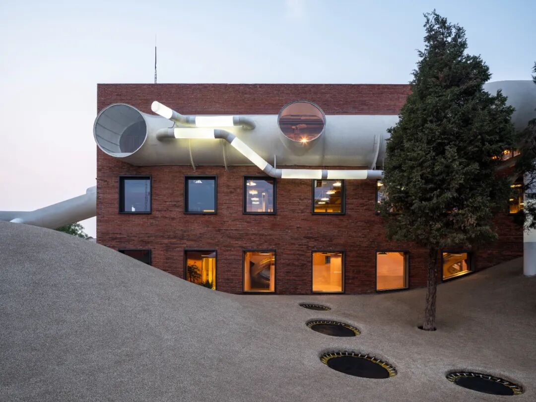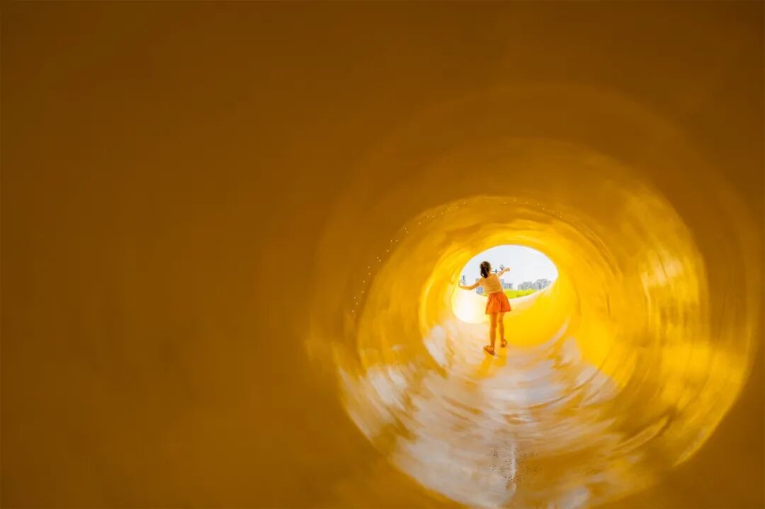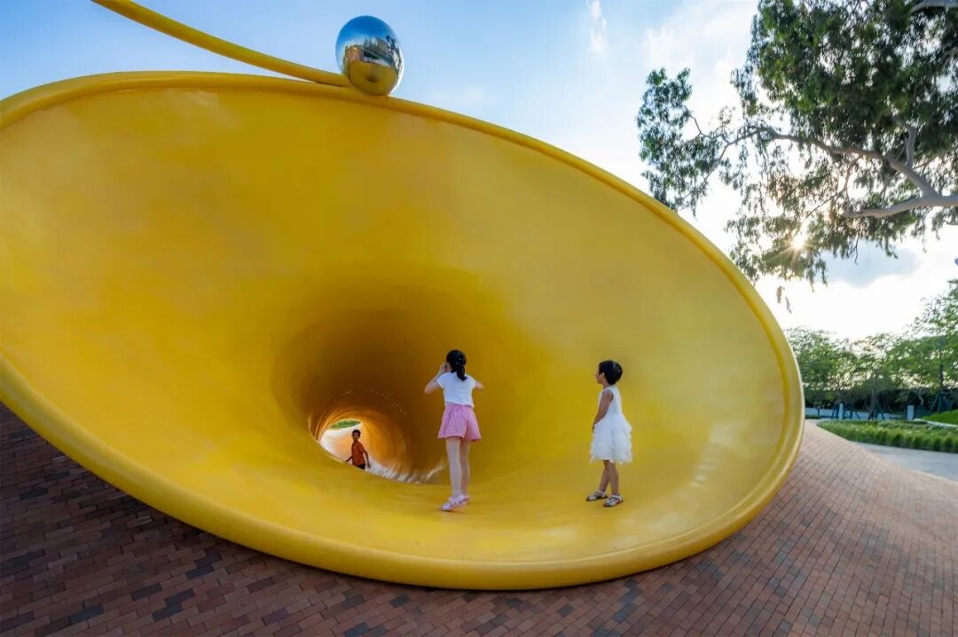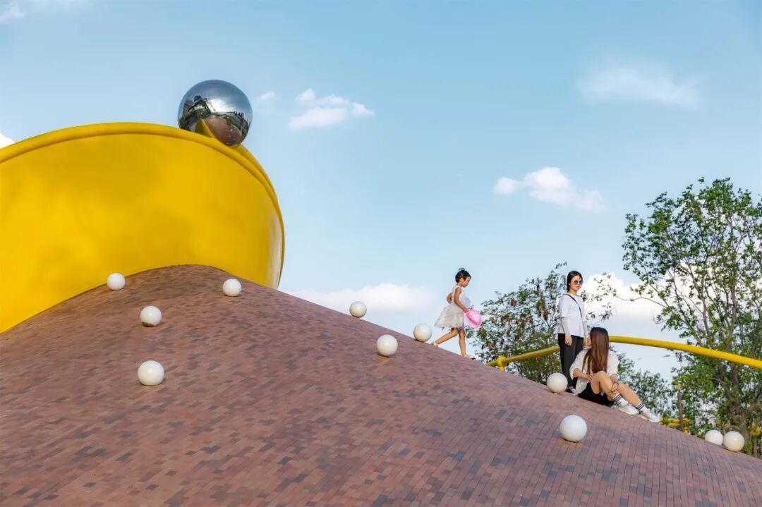 深邃的红撞上活泼俏丽的黄,这座高坡是可观可赏可玩的艺术装置,不仅成为孩子们探索的游戏场,也成为游人休憩获得心灵平静的观景台。