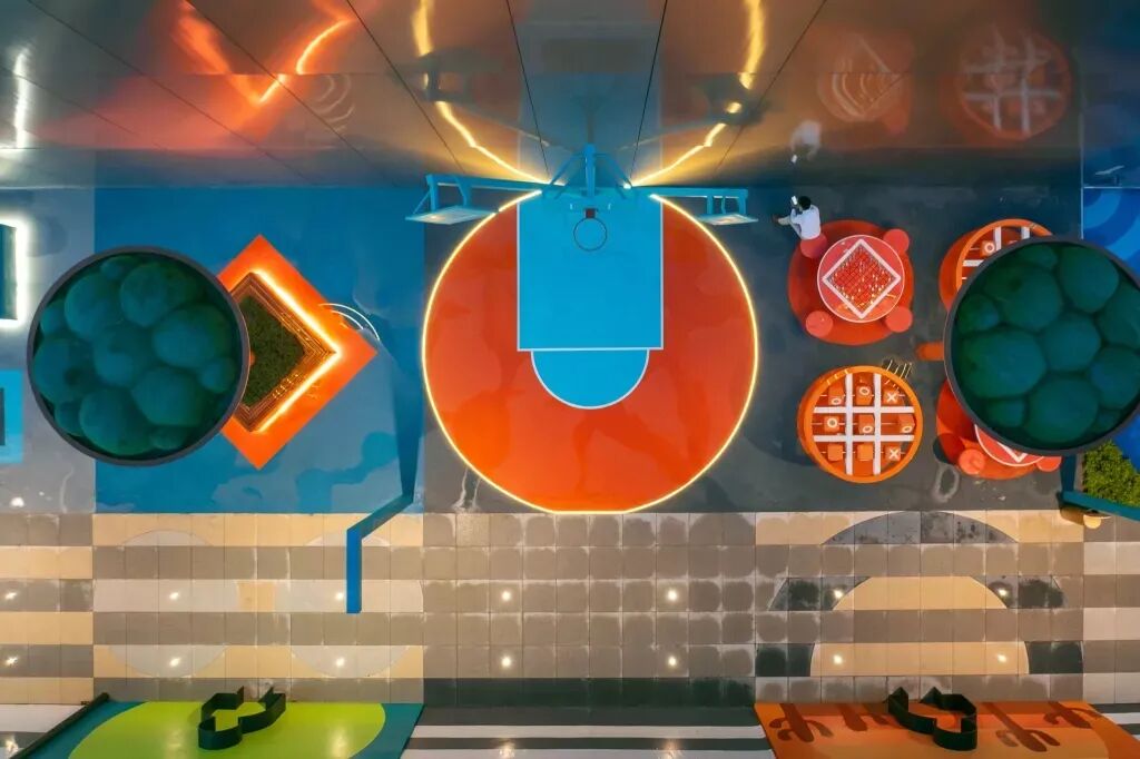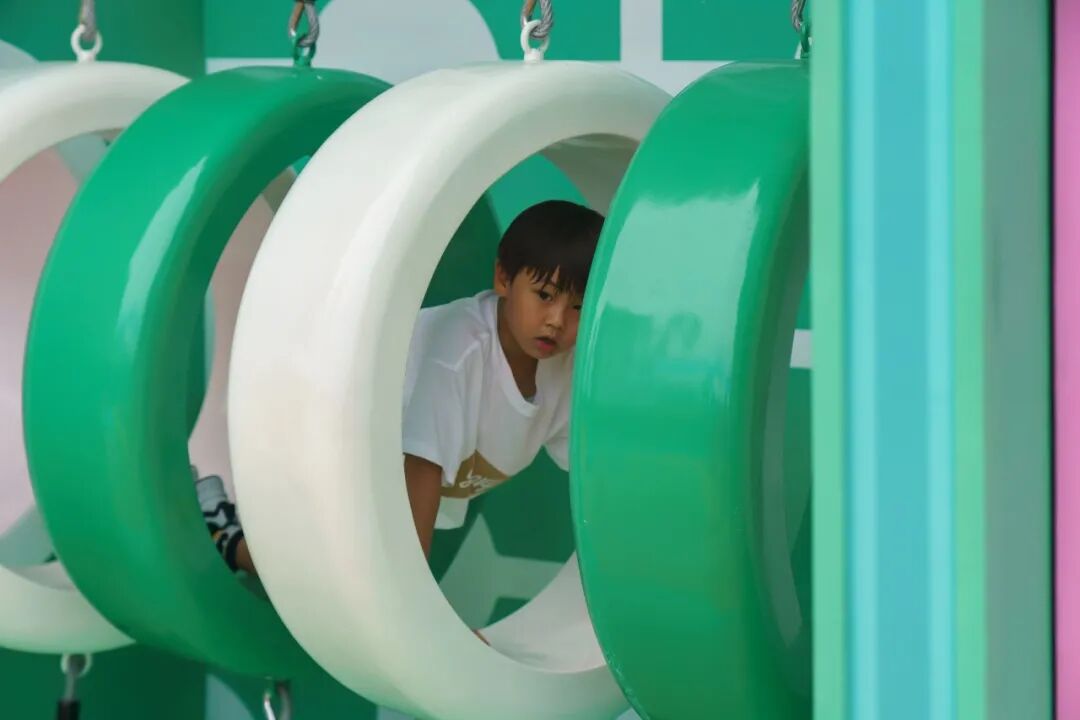 乐园里没有明晰的海宝形象,它以抽象的形式处处留下了痕迹,不过分童稚的设计,让乐园成为更具包容性的存在。不论小孩、大人都可将这个乐园作为主场,其开放的姿态让人们可以从任意界面进入乐园,与珠江共度私人时光,或是满场“跑酷”,或是闲坐赏景,可静可动。