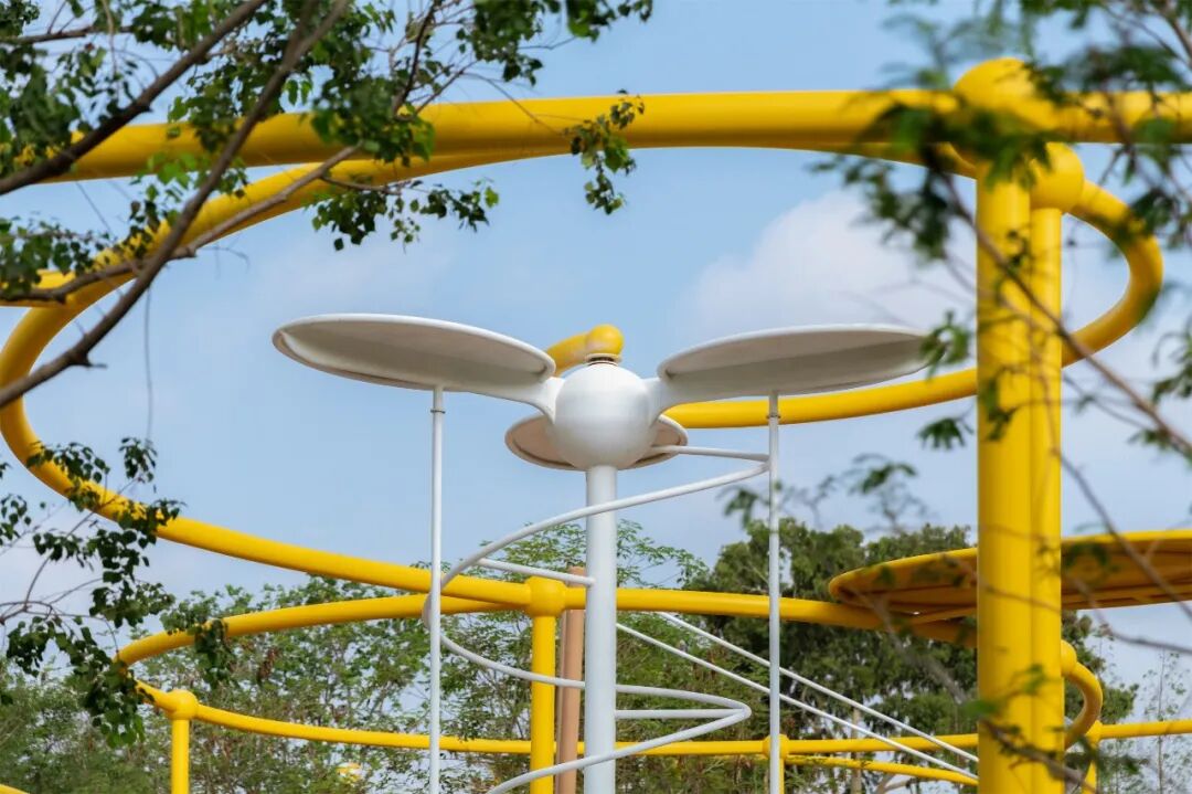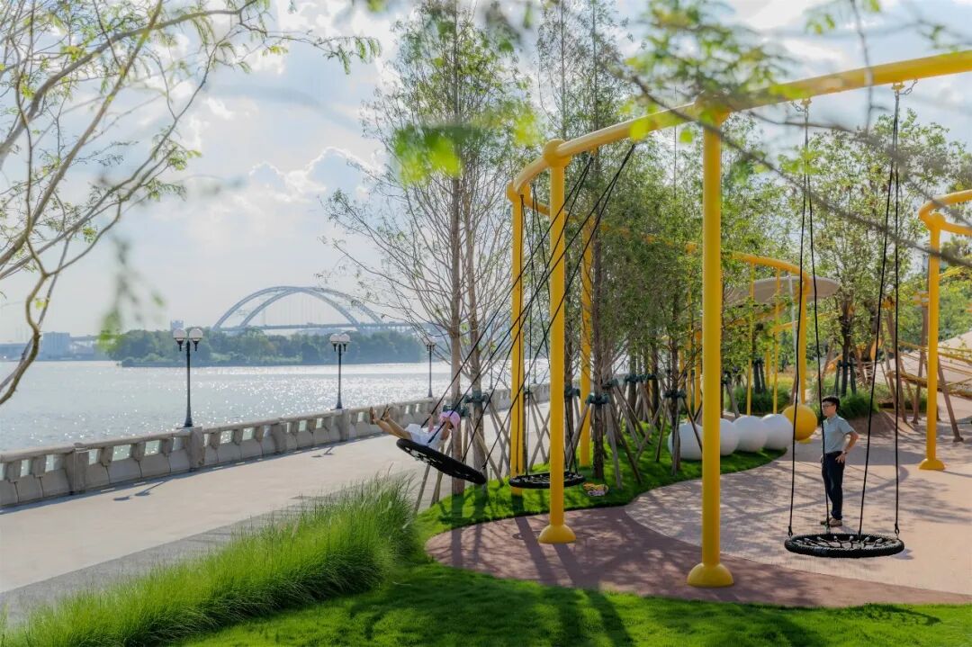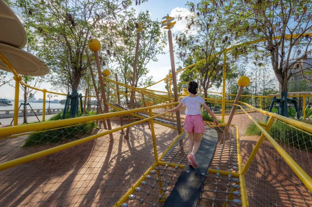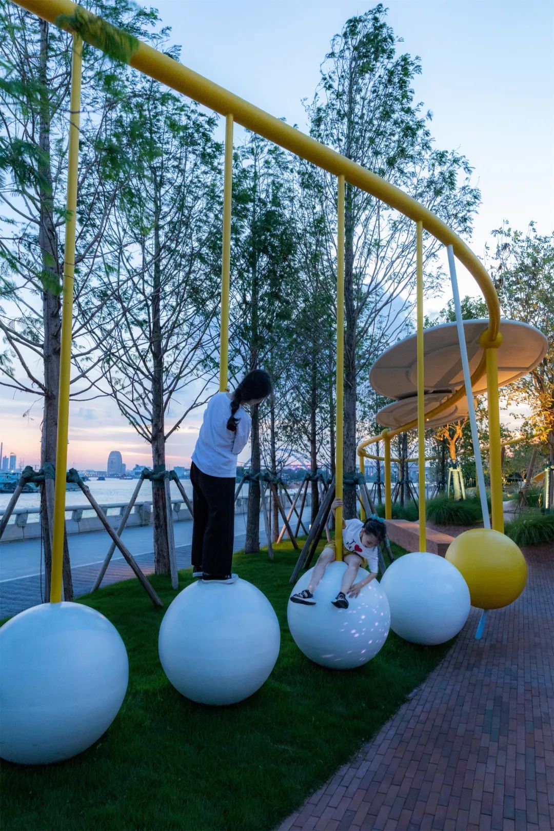 沿着设计的曲线转啊转,穿过野趣的爬网地带,攀爬网两侧黄白相间的风车将捕捉江风的动作向心转动,变成“风球”,让攀爬更增趣味。