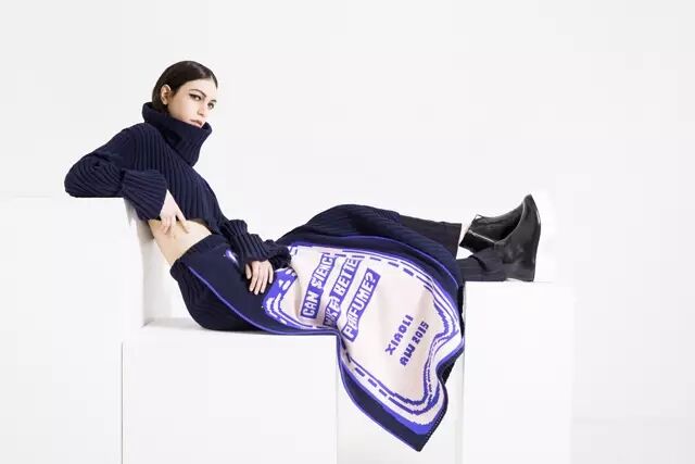 传神精致的编织图像比想象中更难实现,李筱为了更好的传达图案的表现力,费时数月研发3D针织技法,材质方面则依旧是走非常规的道路。硅胶、塑胶以及针织的相互融合发生有趣碰撞,堆积构建出的建筑廓形。