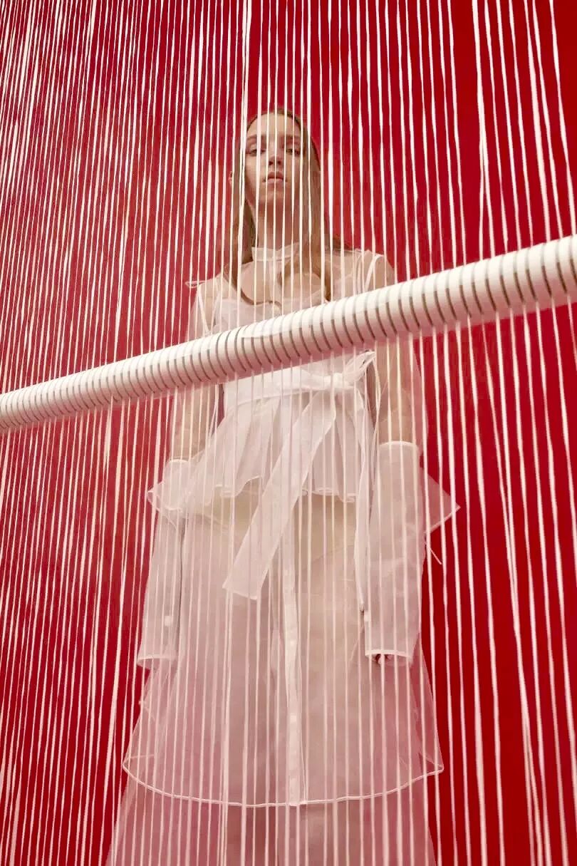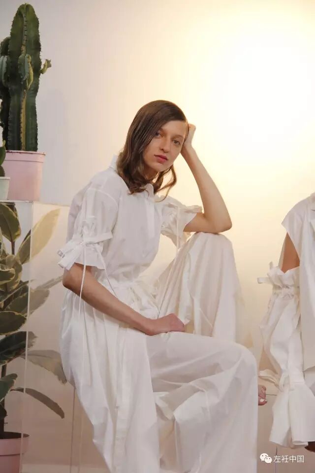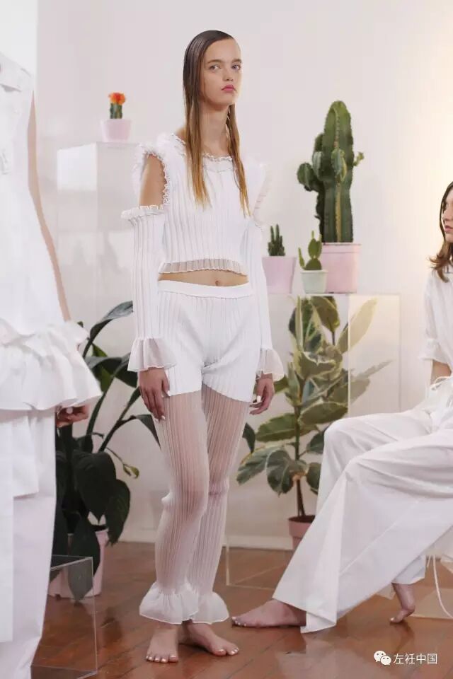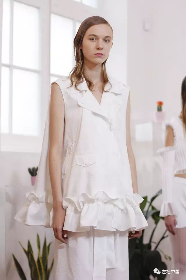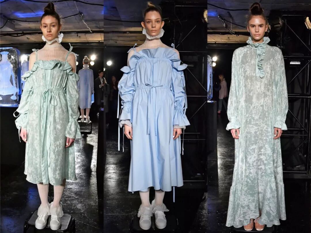 2017春夏的灵感源于在希腊圣托里尼岛上的度假回忆,每次都力图寻求突破的她在这一季设计师将厚重的硅胶替换成了自己新研发的牛仔面料。浪漫的褶皱荷叶边、打结以及绑带元素贯穿始末。