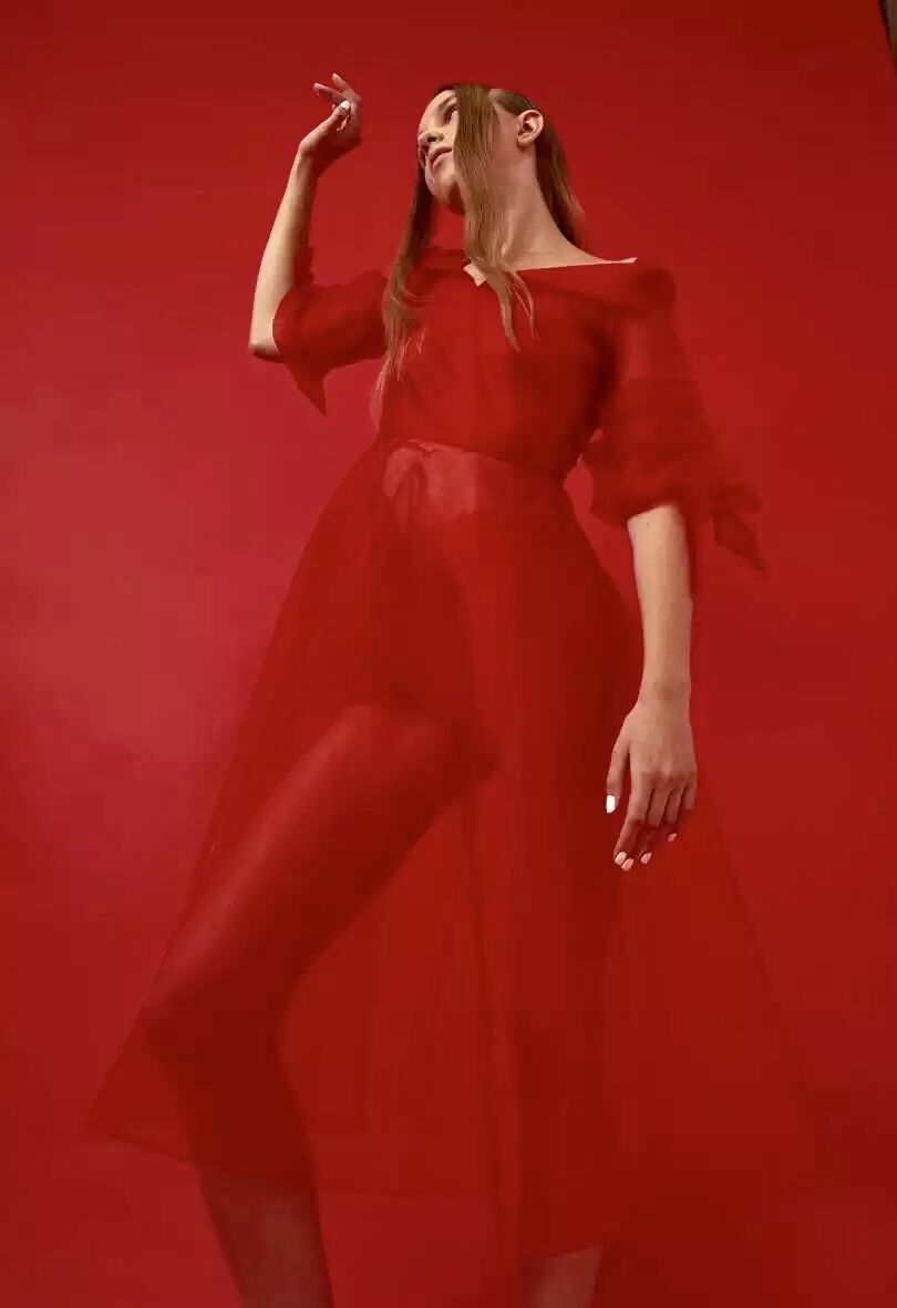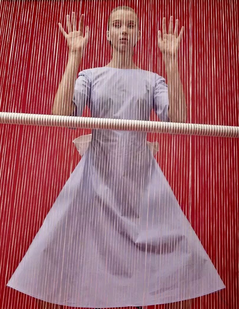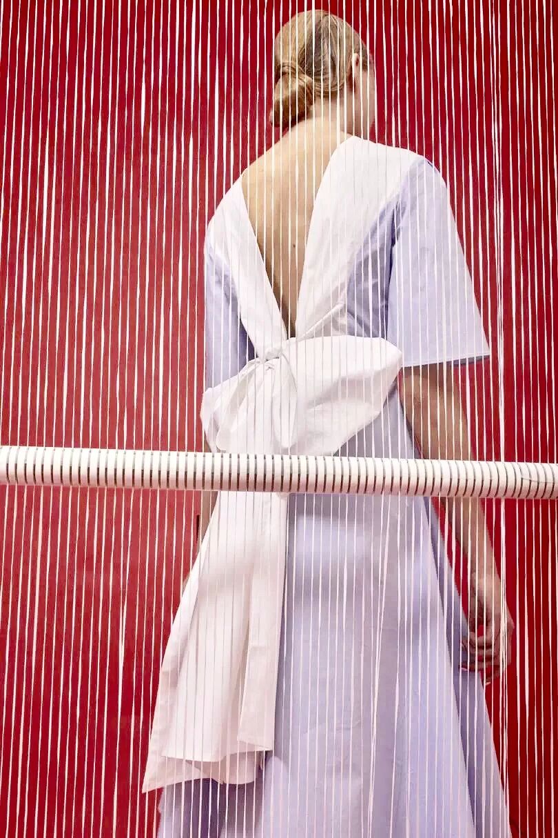 2017春夏的灵感源于在希腊圣托里尼岛上的度假回忆,每次都力图寻求突破的她在这一季设计师将厚重的硅胶替换成了自己新研发的牛仔面料。浪漫的褶皱荷叶边、打结以及绑带元素贯穿始末。